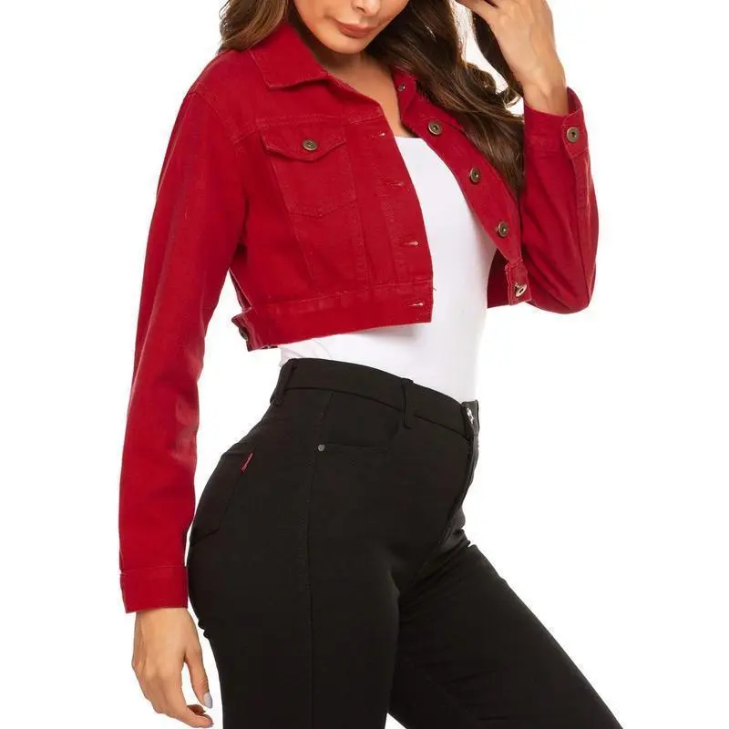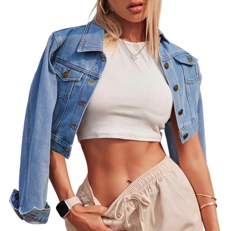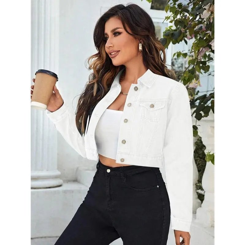 Women's White Cropped Denim Jacket - Long Sleeve, Button Closure, Casual Style with Pockets, Soft Fabric, Perfect for Spring and Autumn Outings Collar Coats Cotton Can be used with a raincoat
