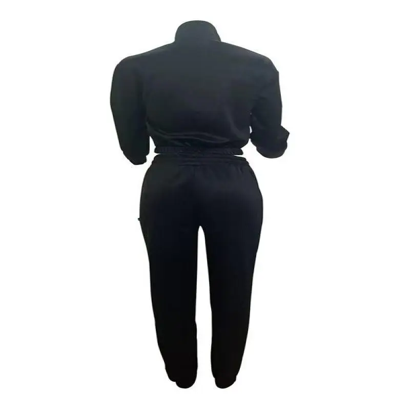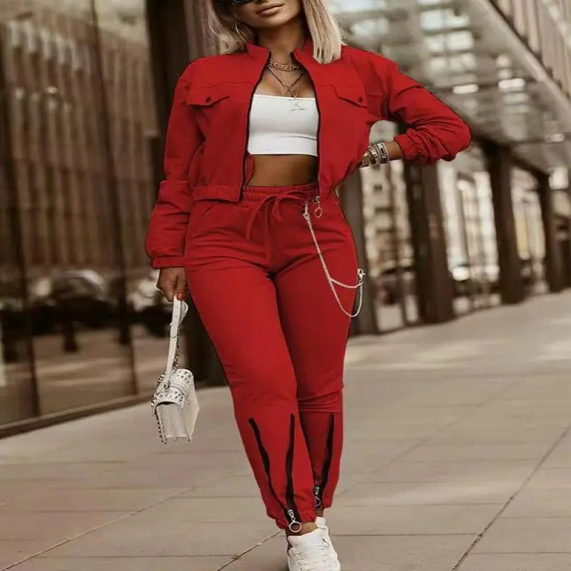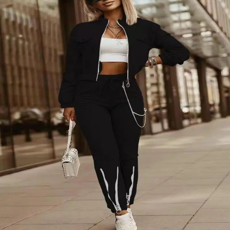 [Functional Pockets]: The zip-up jacket includes practical pockets, providing a secure place for essentials while enhancing the overall look of the outfit./[High Waist Pants]: The high waist trousers offer a flattering silhouette, ensuring a comfortable fit that pairs beautifully with the crop jacket./[Funnel Neck Style]: The funnel neck of the jacket adds a modern touch, providing extra warmth and a unique look during cooler seasons./[Easy Care Fabrics]: This outfit is machine washable, making maintenance uncomplicated and ideal for daily wear without worry.