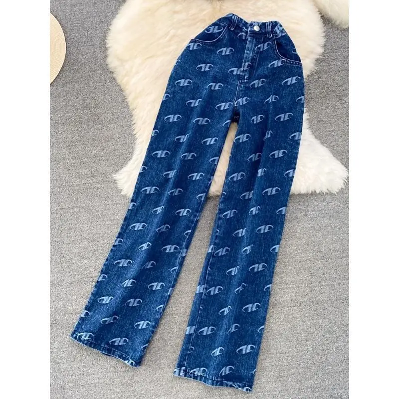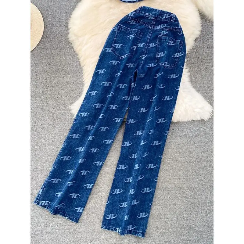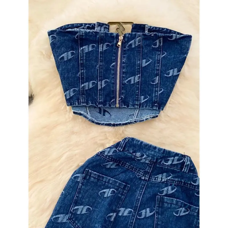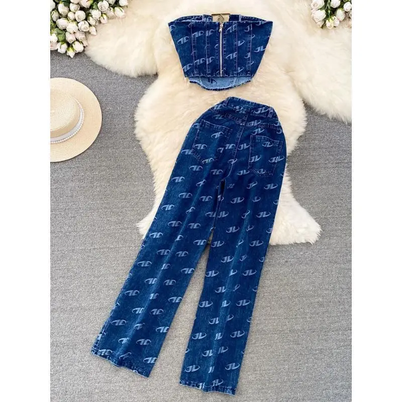 Fashion Set Women's Retro American Style Bra Denim Tank Top Two Piece Casual High Waist Slim Straight Trouser Set Suits Pants Womenswear Clothes Gamis Sleeveless Costume