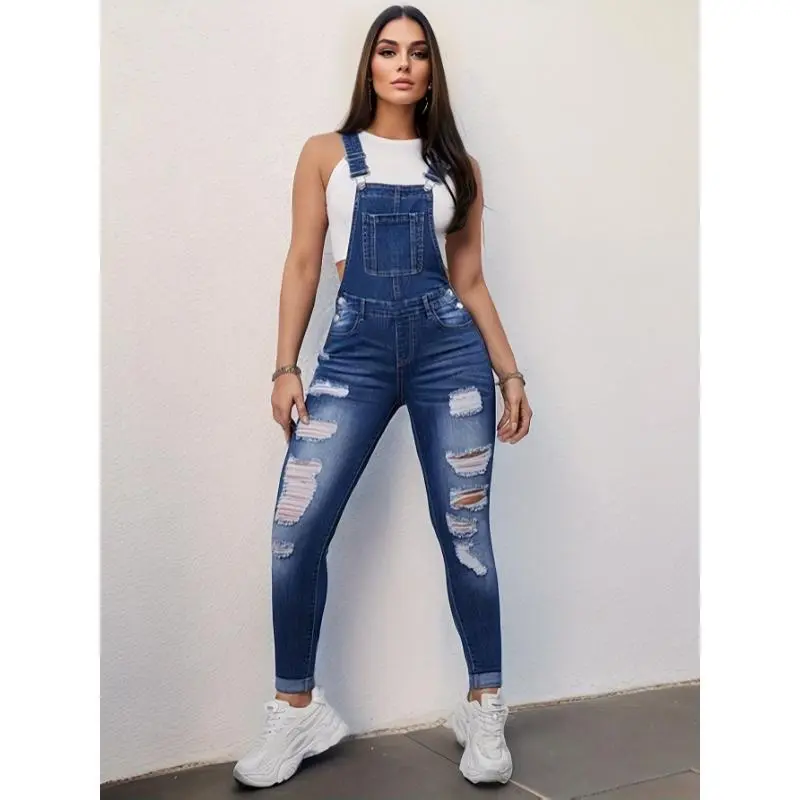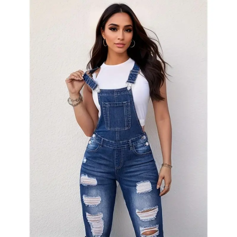 Women Vintage Inspired Ripped Distressed Overalls Whiskering Faded Relaxed Fit Soft Washed Comfortable Viscose Cotton Medium Blue Casual Daily Wear