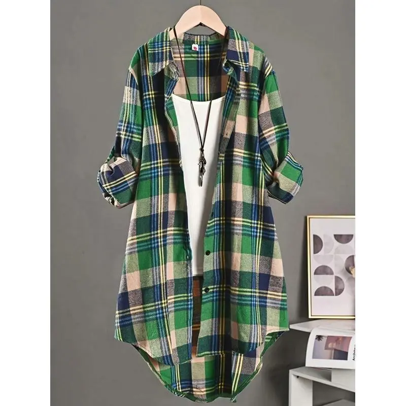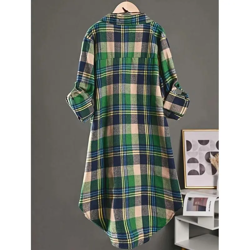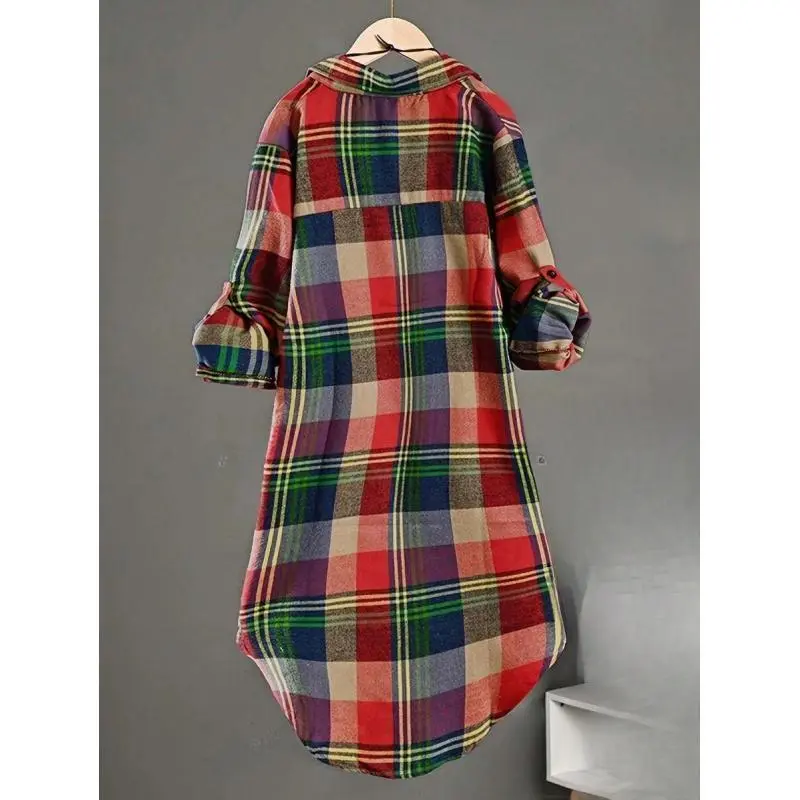 Casual Mid-Length Christmas Plaid High Low Shirt, Autumn Long Sleeve Fabric lightweight knitwear