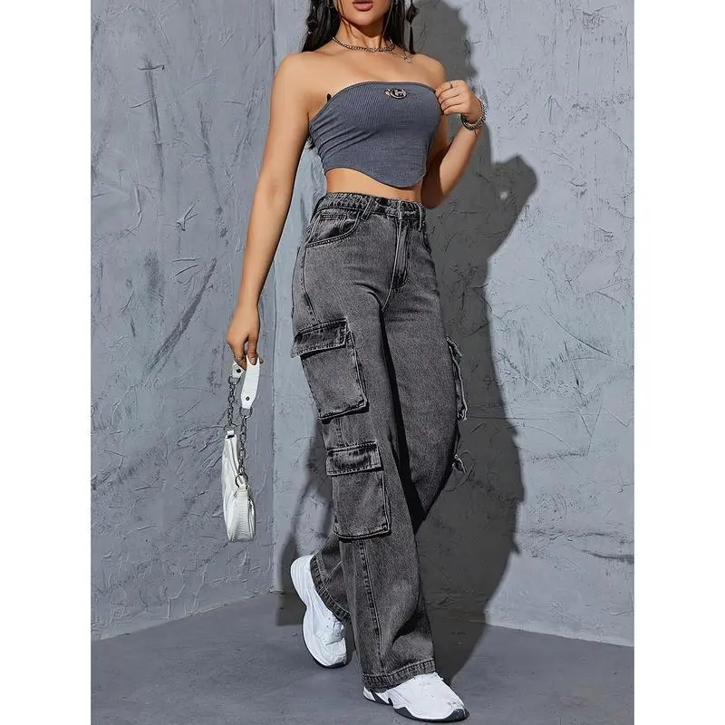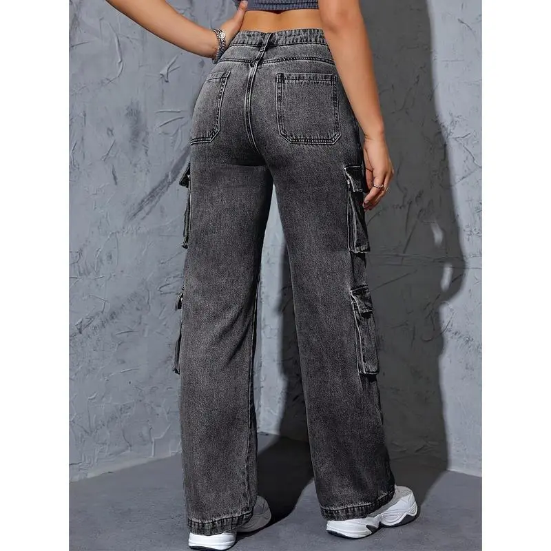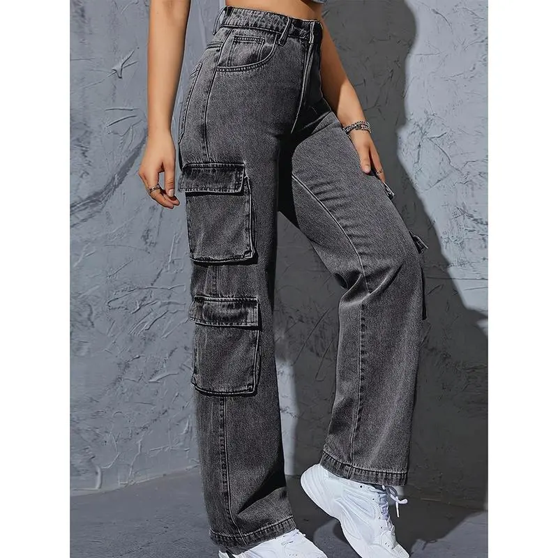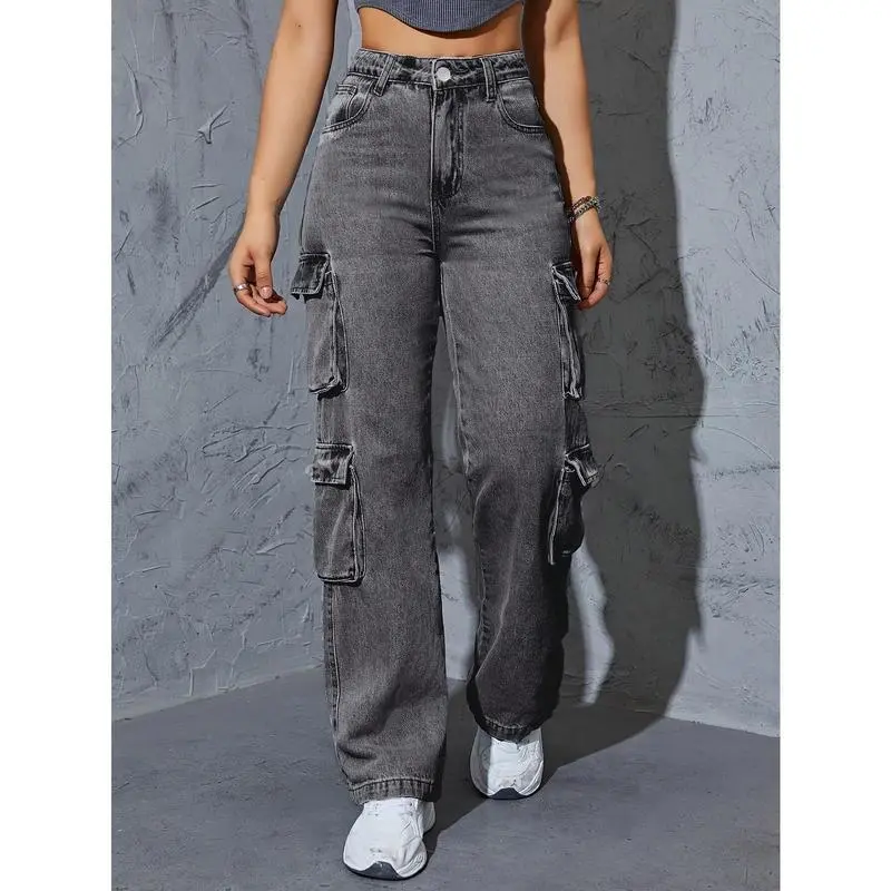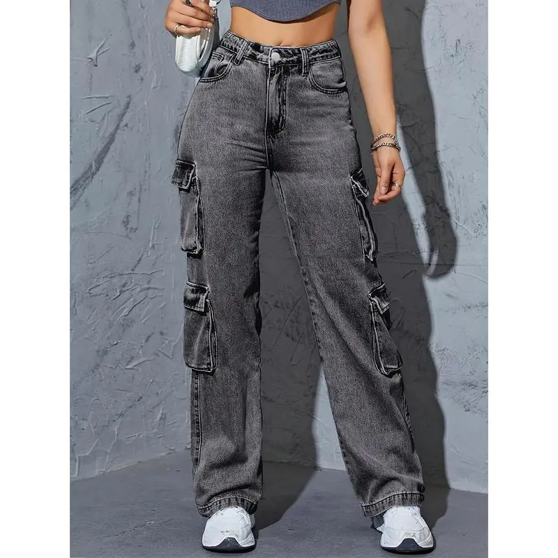 Women's high top multi pocket work pants jeans, dark gray washed straight leg jeans, elastic and loose, suitable for casual style, suitable for casual wear