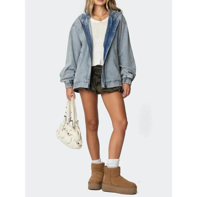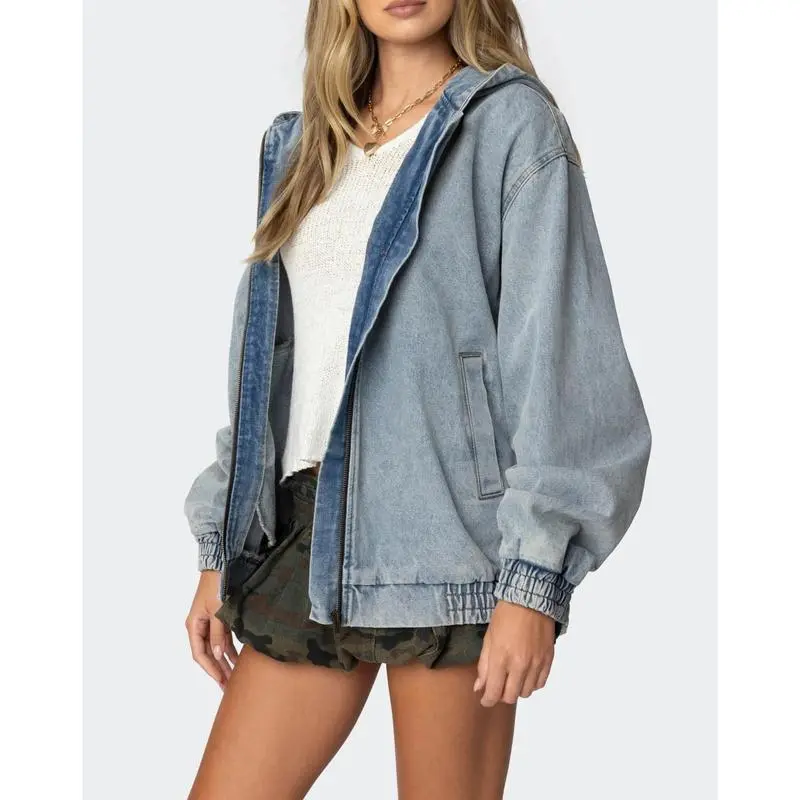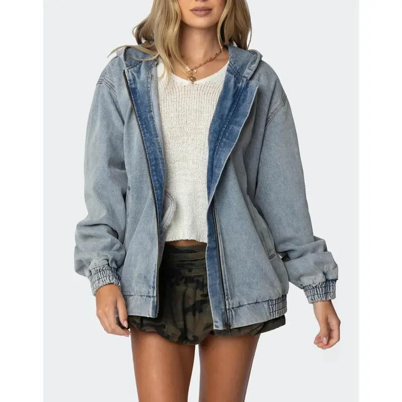 Stay on-trend with our hooded vintage denim jacket in a timeless blue shade. Crafted from 100% polyester, this jacket combines style and comfort effortlessly. The hood adds a laid-back vibe, making it perfect for casual outings or cozy nights in./Size Chart: - S: Chest 36", Length 24", Sleeve 22" - M: Chest 38", Length 25", Sleeve 23" - L: Chest 40", Length 26", Sleeve 24" - XL: Chest 42", Length 27", Sleeve 25"/Available in sizes S to XL, finding your perfect fit is a breeze. Whether you prefer a snug or relaxed fit, this jacket has got you covered. Pair it with jeans for a classic denim-on-denim look or layer it over a dress for a chic twist./Add this versatile piece to your wardrobe and effortlessly elevate your everyday outfits. With its retro charm and cozy feel, our hooded denim jacket is a must-have for any fashion-forward individual./Tags: denim jacket, vintage style, hooded jacket, blue, cozy, comfortable, retro, polyester, S, M, L, XL, fashion.