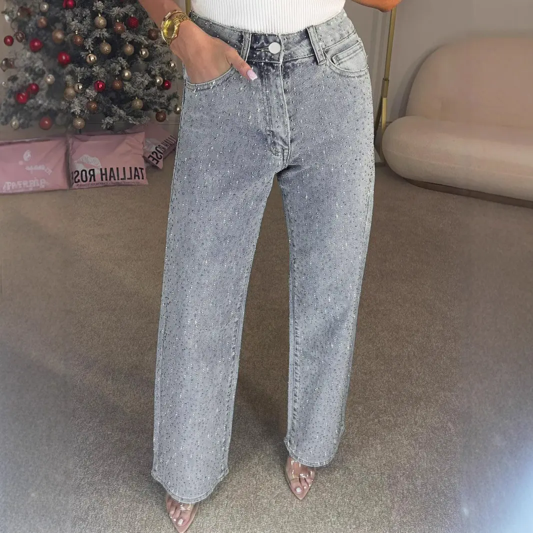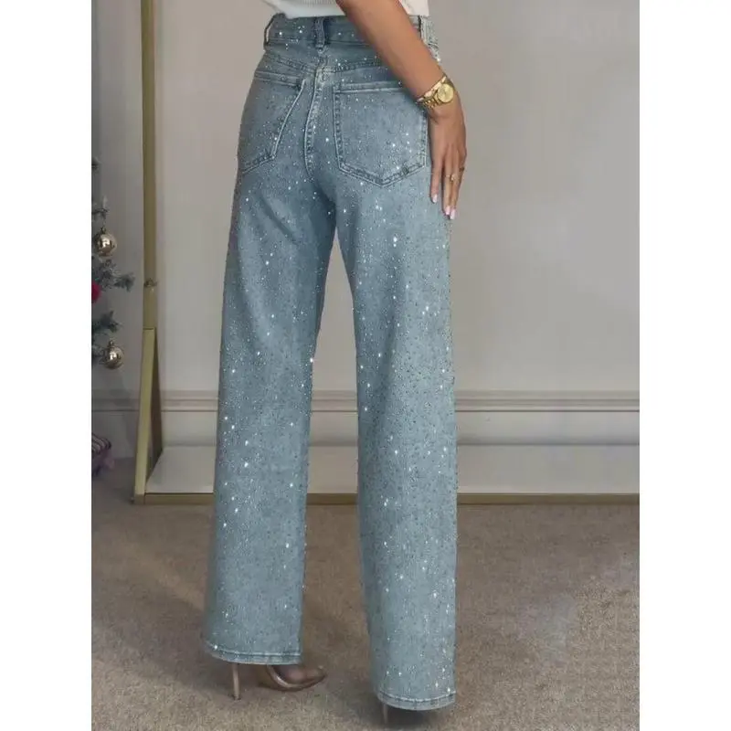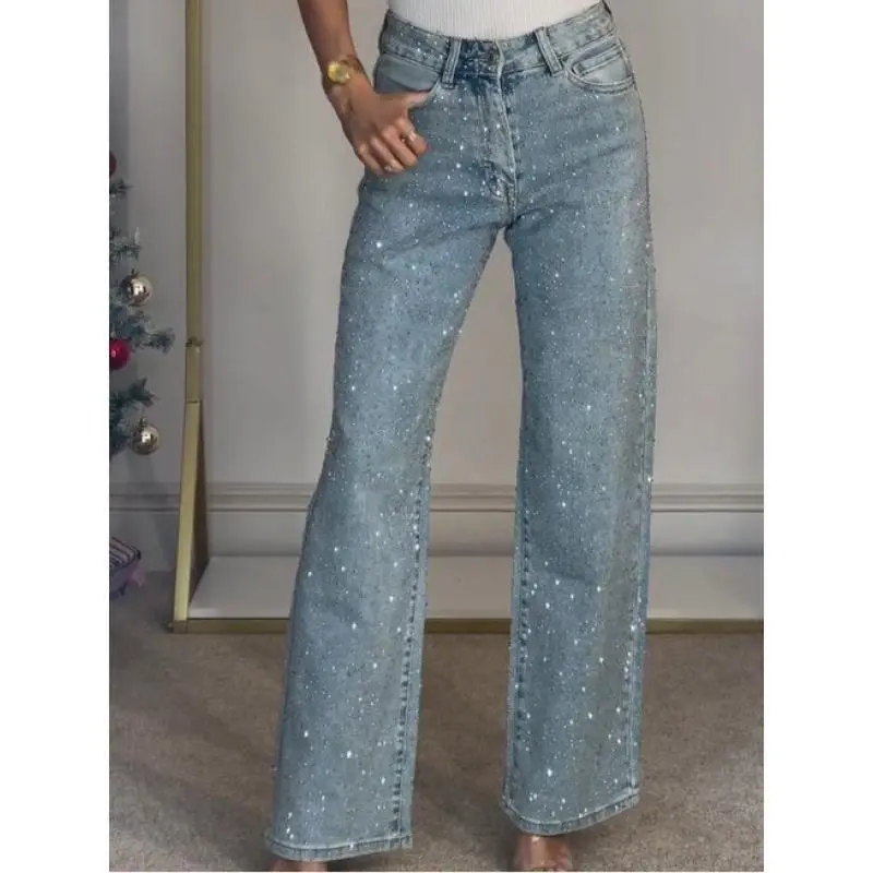 These light blue jeans are a dazzling choice for adding some sparkle to your look. Covered in shimmering embellishments, they feature a classic straight - leg fit and a high - waist design for both comfort and style. Perfect for festive occasions or when you want to make a glamorous statement, pair them with a simple top to let the jeans shine.