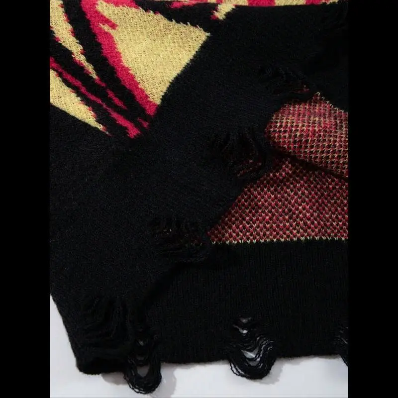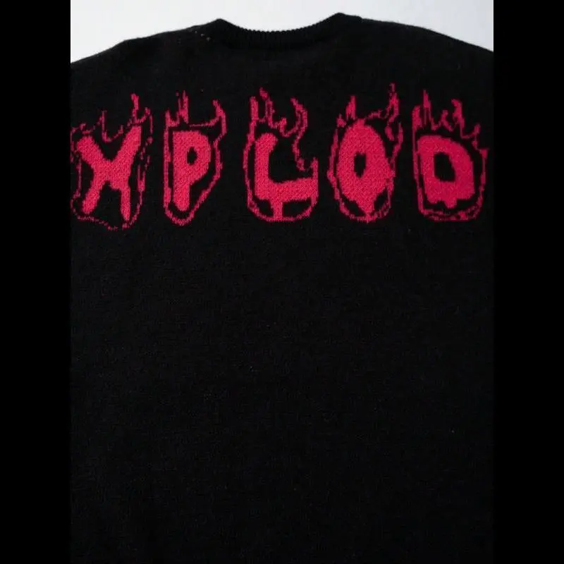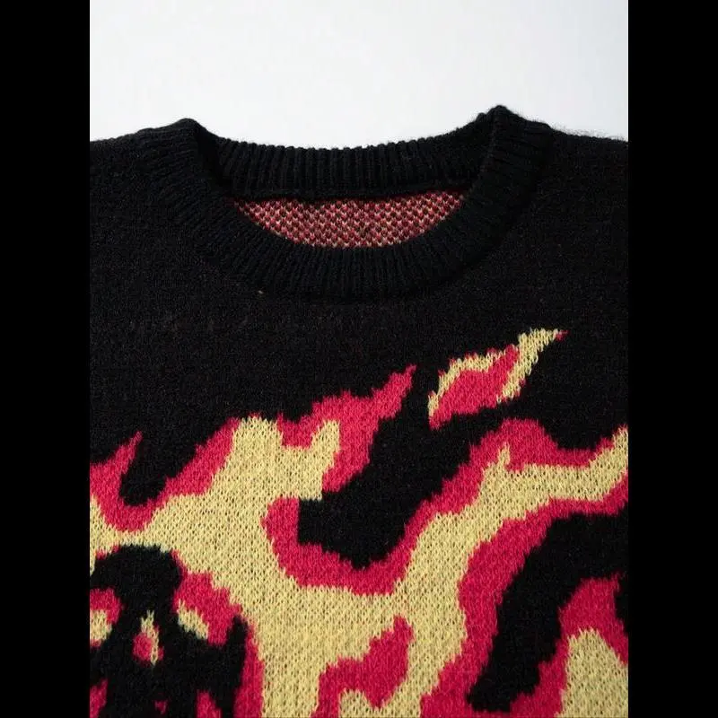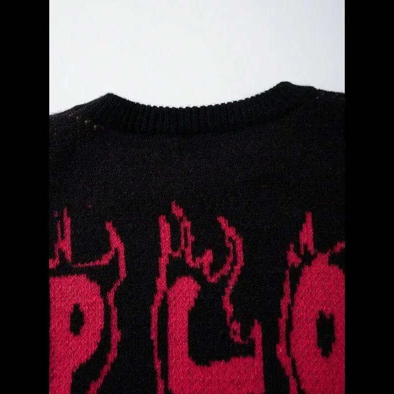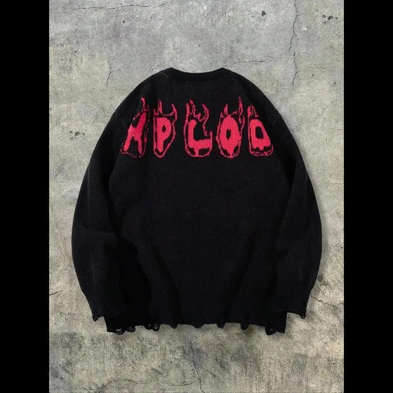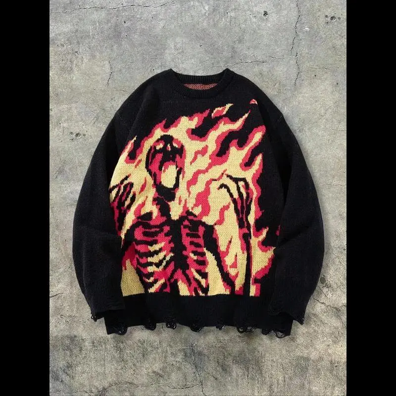 【Punk Aesthetic】: Features an abstract flame skull pattern, bringing a unique visual appeal to your outfit./【Robust Fabric】: Crafted from moderate thickness sweater fabric, combining durability with a soft touch for daily wear./【Unisex Fit】: Tailored in a loose-fitting style, designed to flatter all body types while maintaining a relaxed vibe./【Seasonal Versatility】: Suitable for spring and fall, transitioning seamlessly between different weather conditions with ease./【Unique Hem】: Showcases a distressed edge at the hem, adding a touch of individuality that distinguishes it from traditional sweaters.