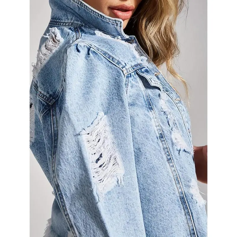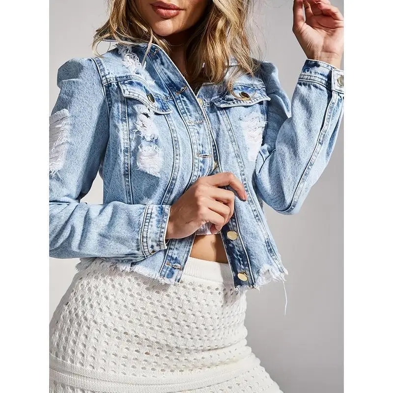 Long Sleeve Distressed Cropped Denim Jacket, Raw Hem Frayed Fabrics Flap Pocket Light Blue Denim Coats, Women's Denim Jackets & Clothing Short Fit Can be used with a raincoat