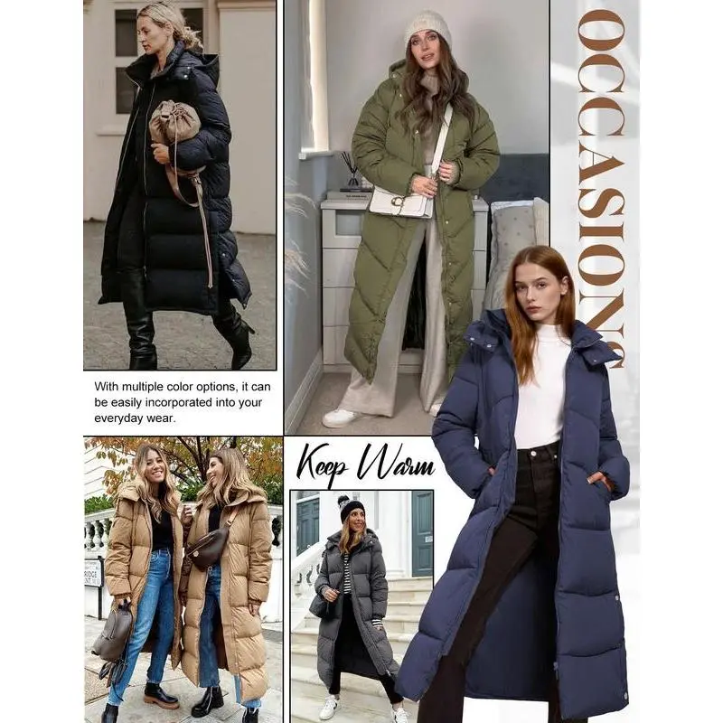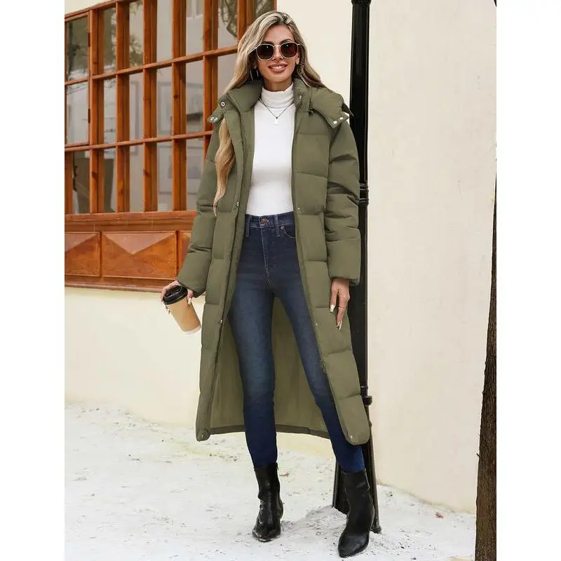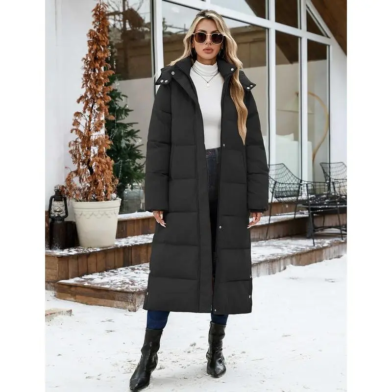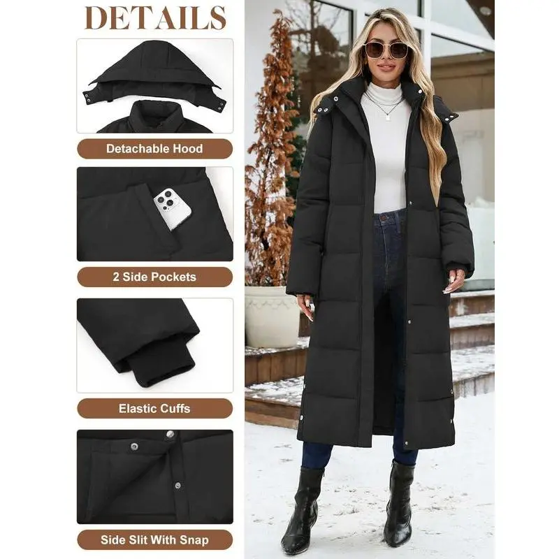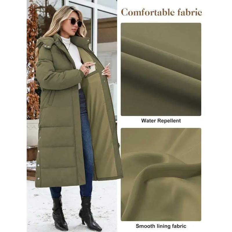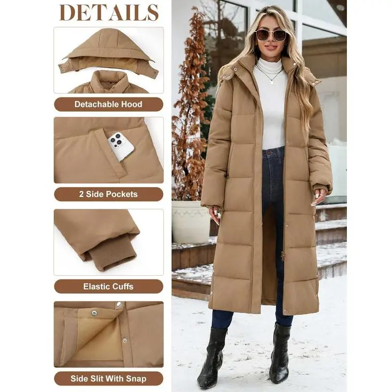 Women Long Puffer Down Coat Thickened Quilted Padded Jacket Winter Warm Zip Parka Removable Hood Buttoned Slit Hem