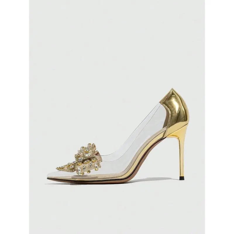 Women's butterfly flower rhinestone decorated pointed high heels, fashionable silver and champagne colored shoes
