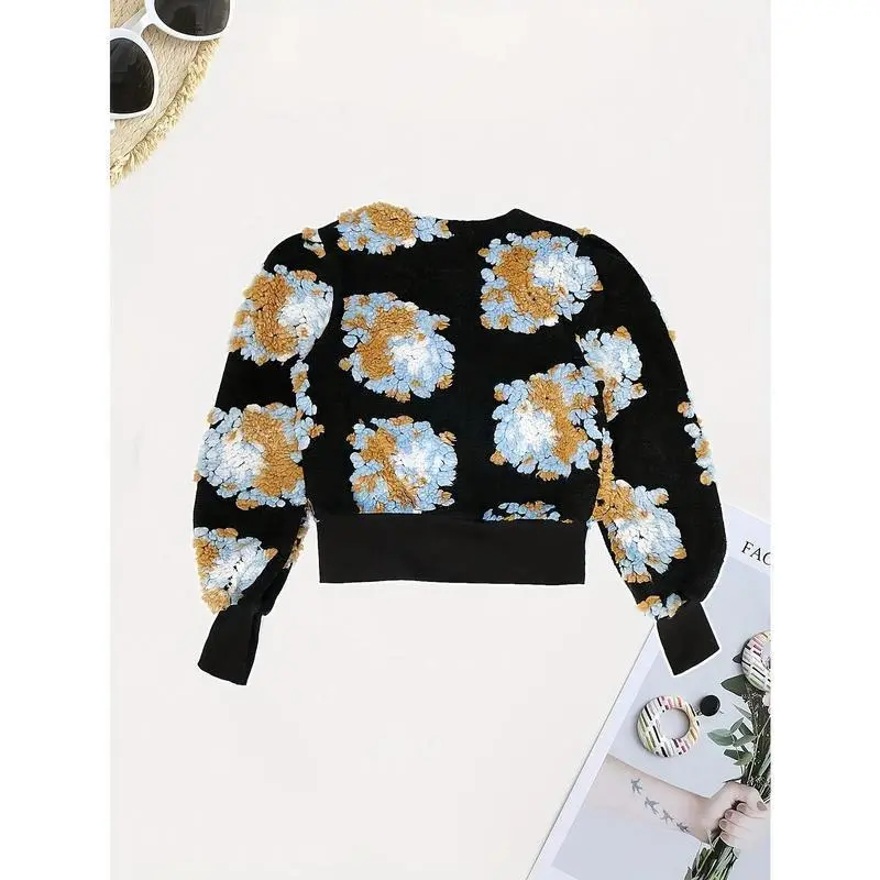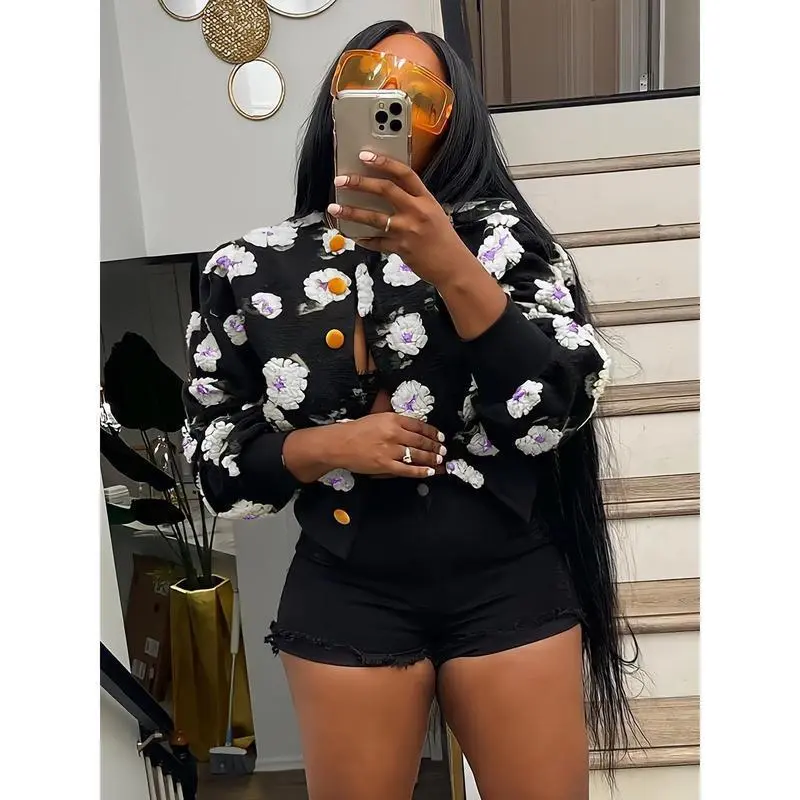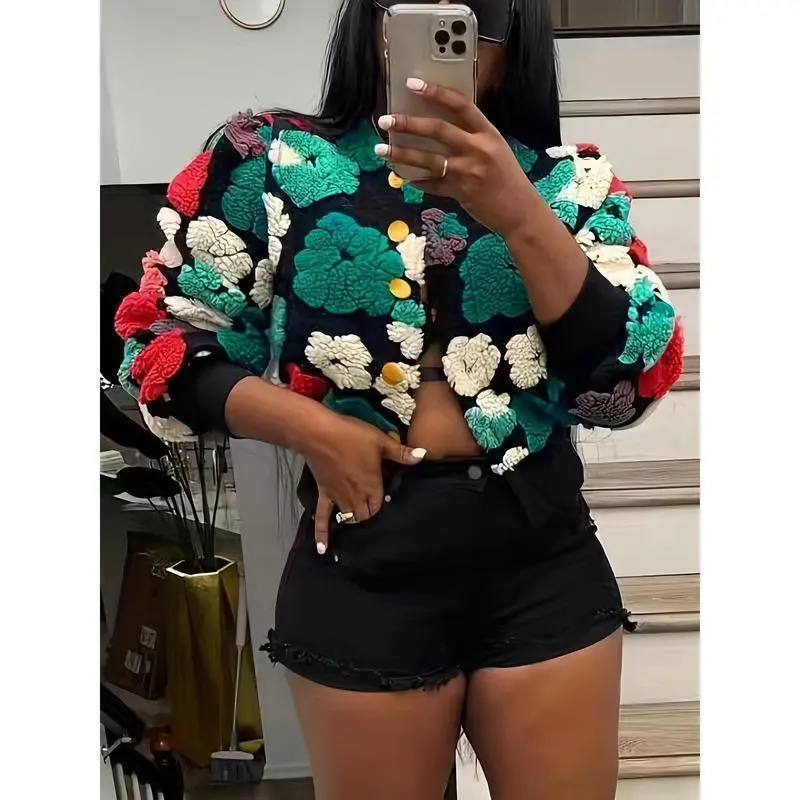 Women's Casual Floral Print Crop Jacket - Long Sleeve Button Front Lightweight Jacket for Fall & Winter, Machine Washable Layering Piece with Vibrant Multicolor Design, Cute Jacket