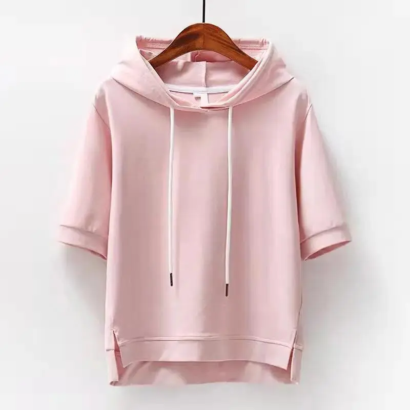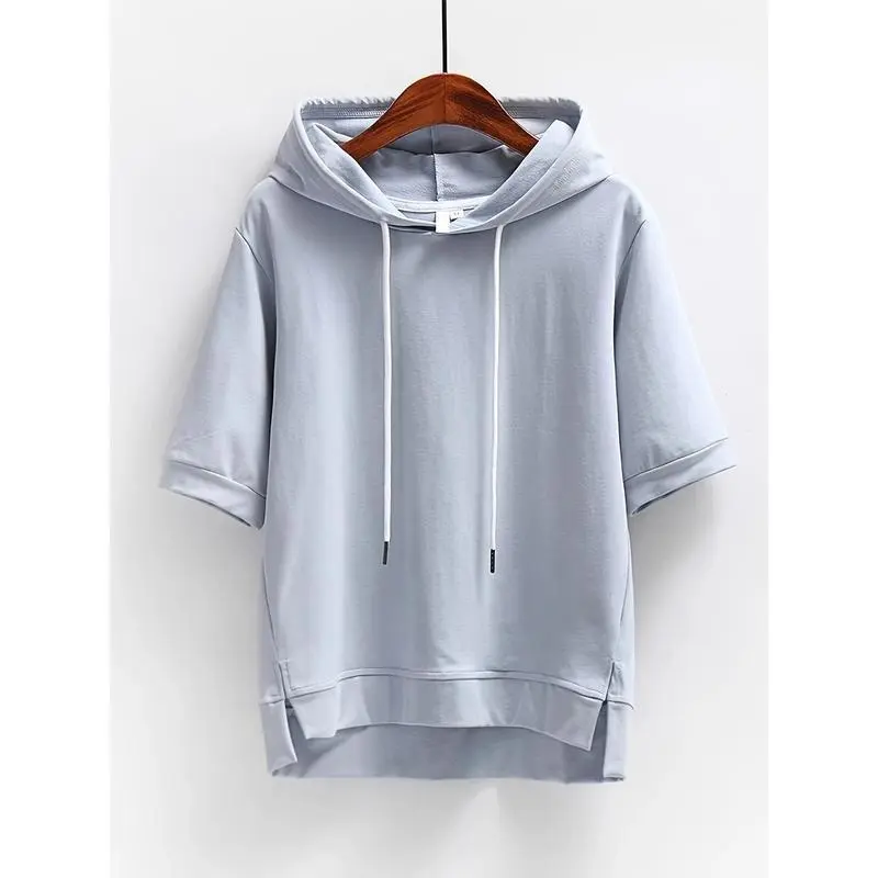 Light Blue Women's Casual Summer Hoodie - Chic Short Sleeve Pullover with High-Low Hem, Drawstring Hood, and Side Slit - Soft Polyester Blend, Machine Washable, A-Line Cut, Sweater Hoodie Womenswear Sweatshirts