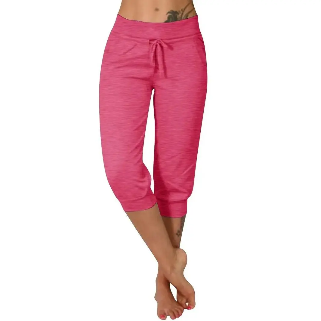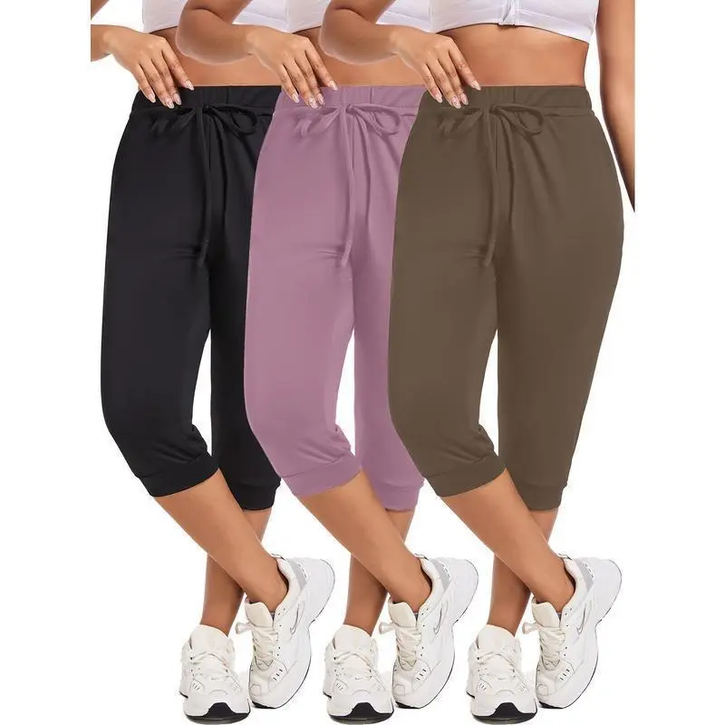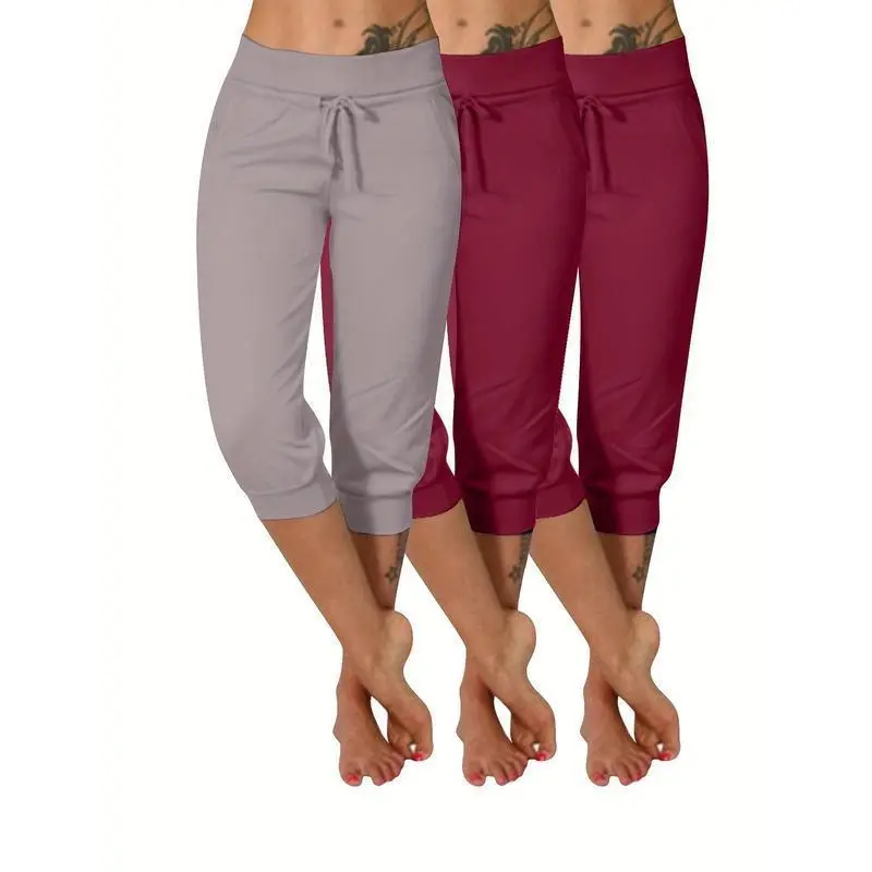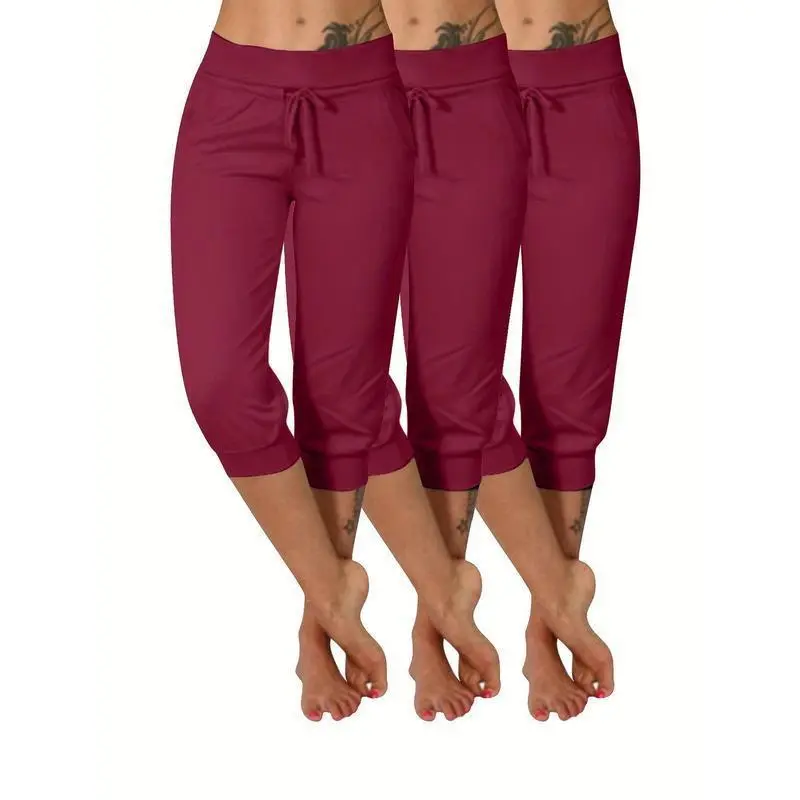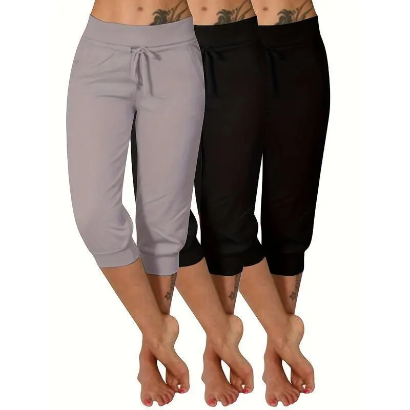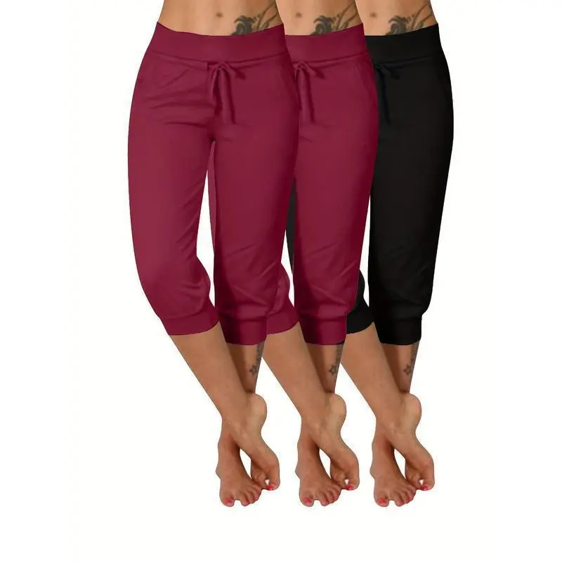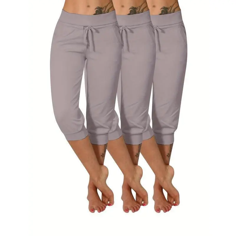 3pcs Plus Size Women'S Yoga Capris - Solid Color with Drawstring, Stretchy Polyester Blend, Mid-Calf Pants with Pockets Fitness Summer Bottoms