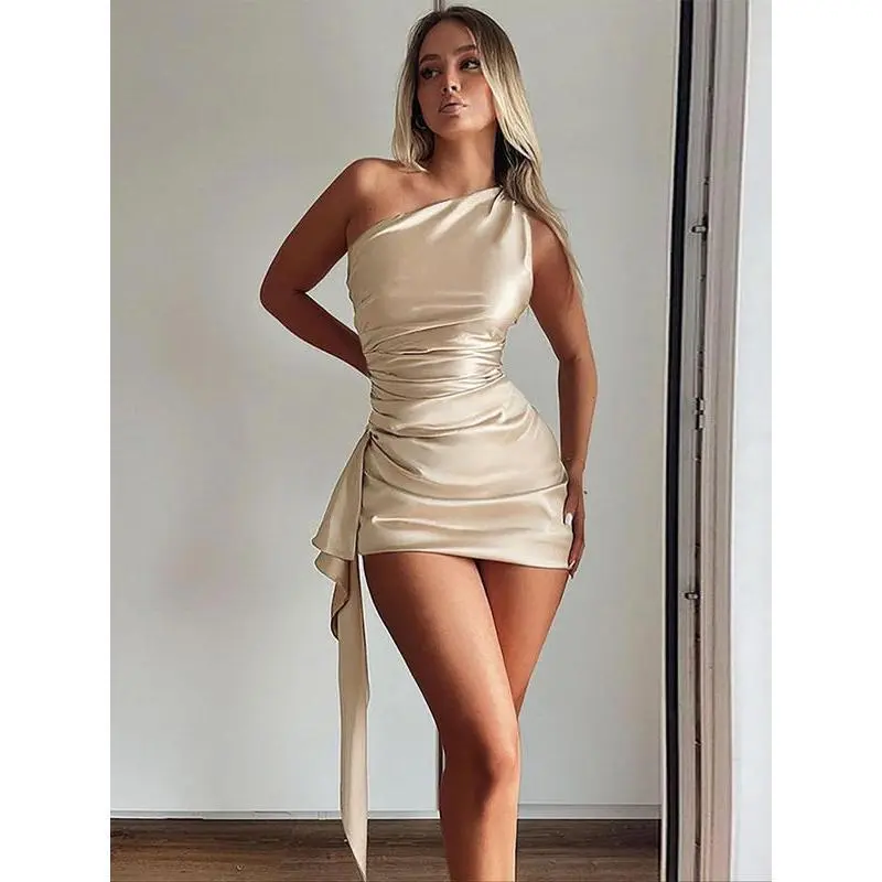 Women's Asymmetrical Ruched One Shoulder Bodycon Dress, Women's Dresses, Solid Sleeveless Ribbon Short Dress for Party Club Dating Wear, Fashion Sundress, Dresses for Women, Summer Homecoming Dresses, 90s Clothes