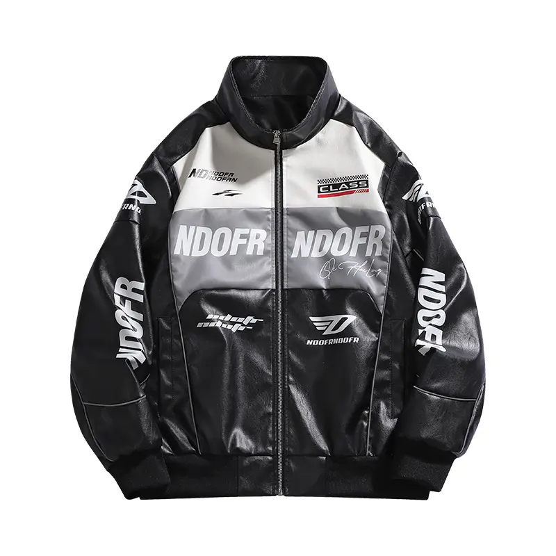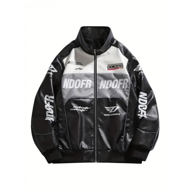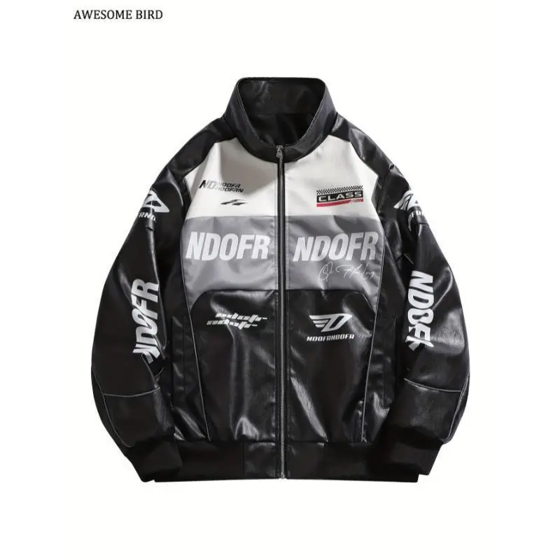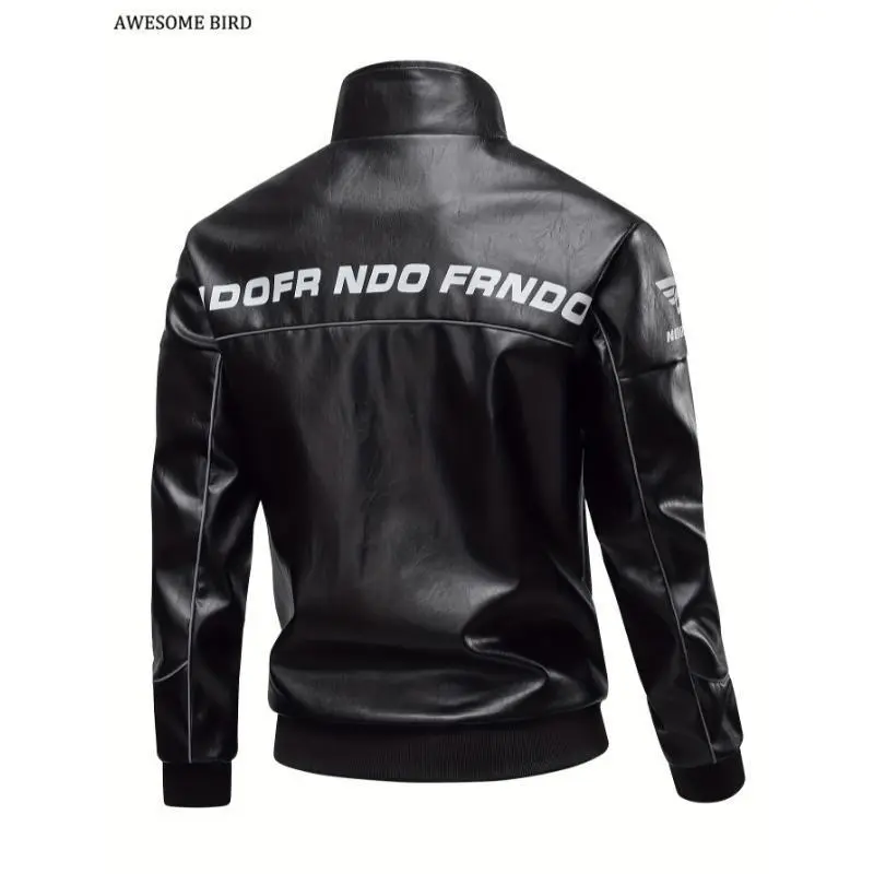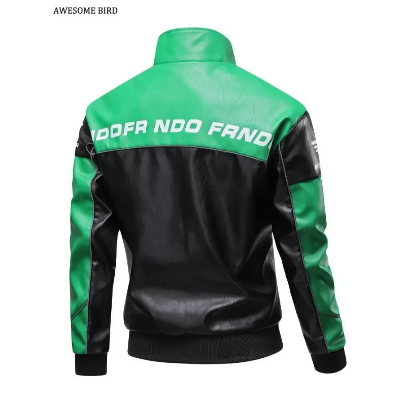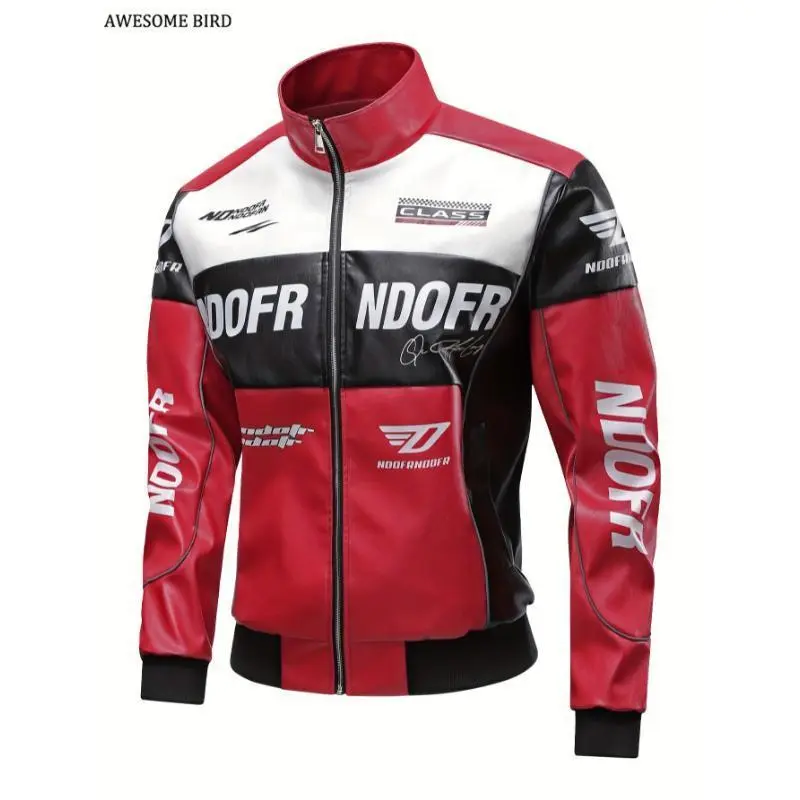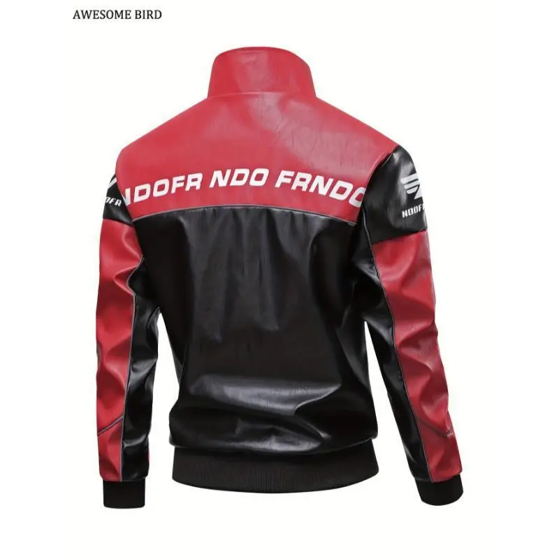 [Leather Biker Jacket] Green & Black Men's PU Leather Biker Jacket - Color Block Racing Style with Zipper Closure, Stand Collar, Bird Sleeve Casual Fabric Menswear Coats Polyester Tops 【Red】