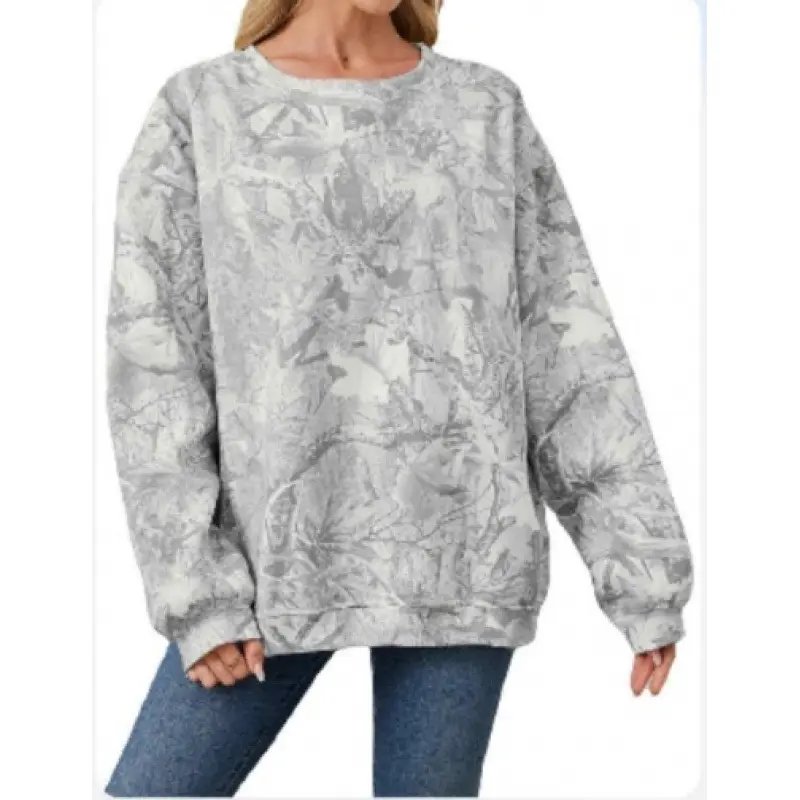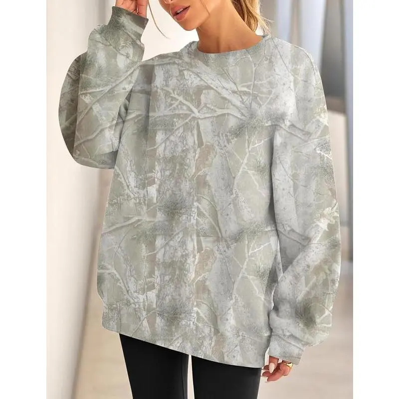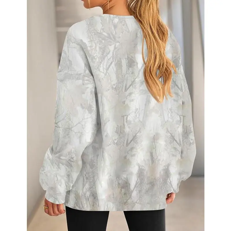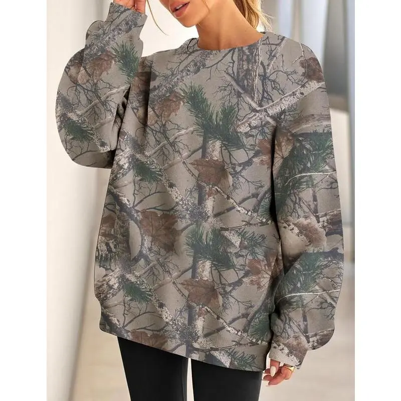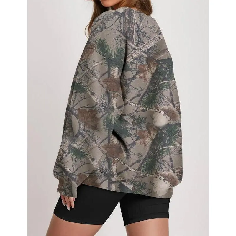 This oversized camo graphic print sweatshirt is made from a premium cotton-blend fleece fabric, soft, warm, and cozy on the inside. Lightweight yet insulating, it’s a must-have wardrobe essential for the fall and winter seasons. Features: