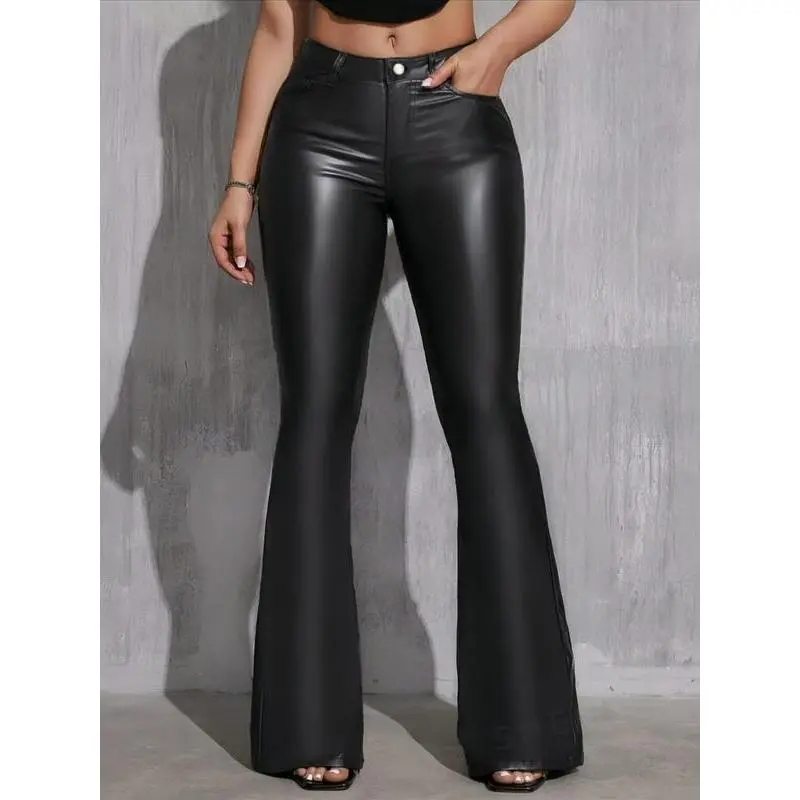 Women's Solid Color PU Leather Flare Leg Pants, Fashion Casual High Waist Bell Bottom Trousers for Daily Outdoor Wear, Women Bottoms for Fall, Womenswear Basic Fitted