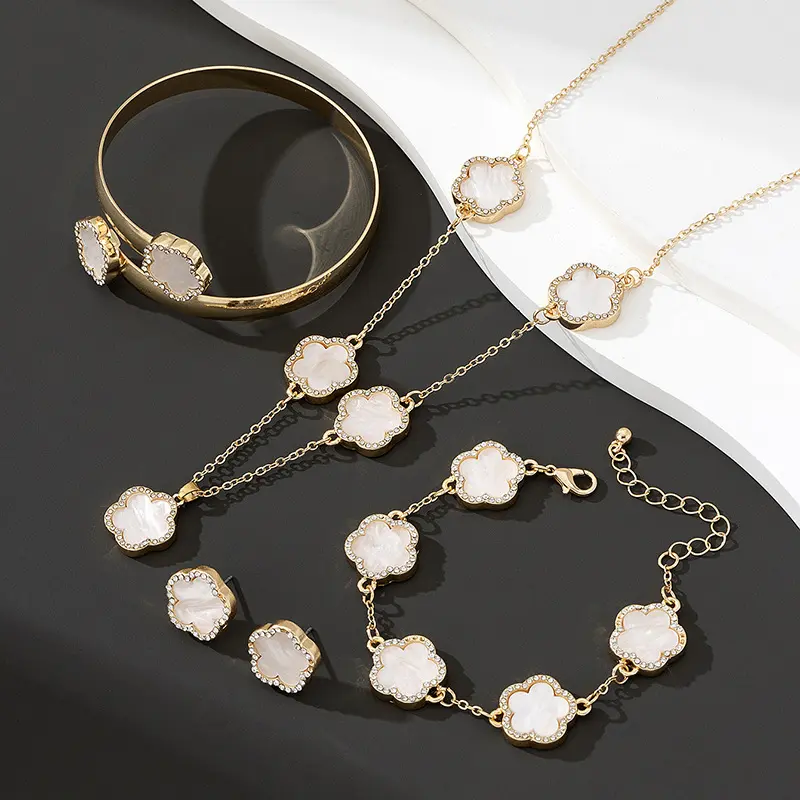 This set includes a Lucky Four-Leaf Clover Pendant Necklace, a bracelet, and a pair of earrings. Perfect for Valentine's Day, Mother's Day, or as a gift for mom. The set is designed for daily wear and features a five-leaf clover element. 🌿 Style and Occasion: 🎨 Color and Material: 🎁 Ideal Gift: This jewelry set is a thoughtful gift for special occasions. It is suitable for women and adds a touch of elegance to any outfit.