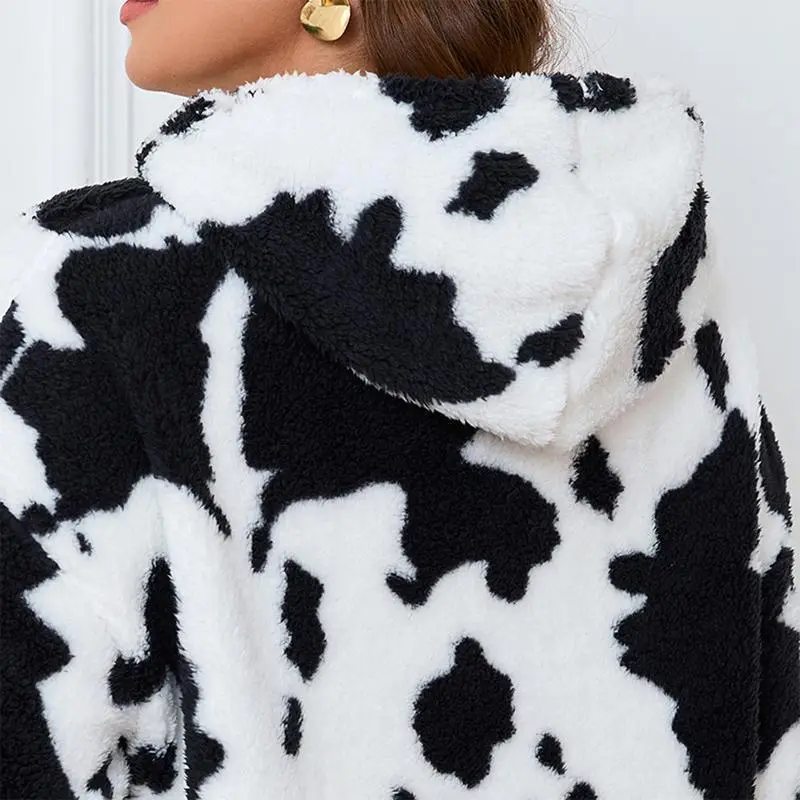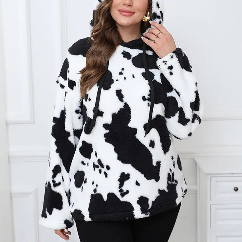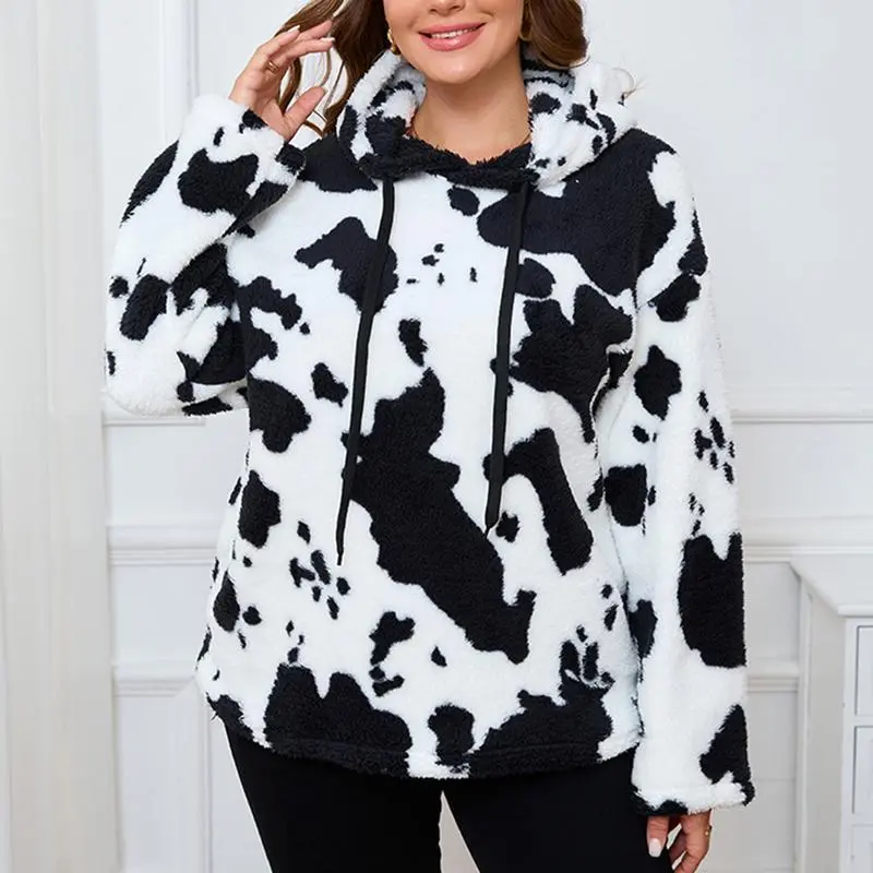 Women'sWinterPlushHoodedSweatshirtLongSleeveCowPrintLooseDrawstringHoodie,LadiesClothesforIndoorOutdoorWear,LadiesClothesforDailyWear
