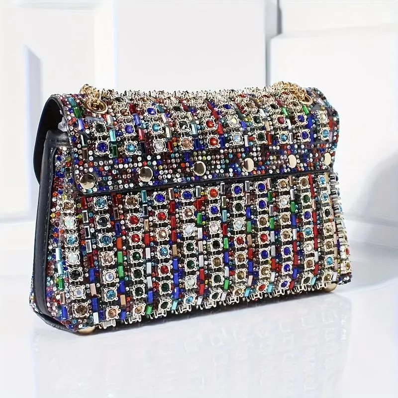 Luxurious Rhinestone & Beaded Women’s Evening Clutch - Elegant Multicolor PU Handbag with Adjustable Strap, Golden-Tone Hardware for Banquets, Weddings & Formal Events, Formal Event Bag | Elegant Evening Clutch | Magnetic Closure Bag