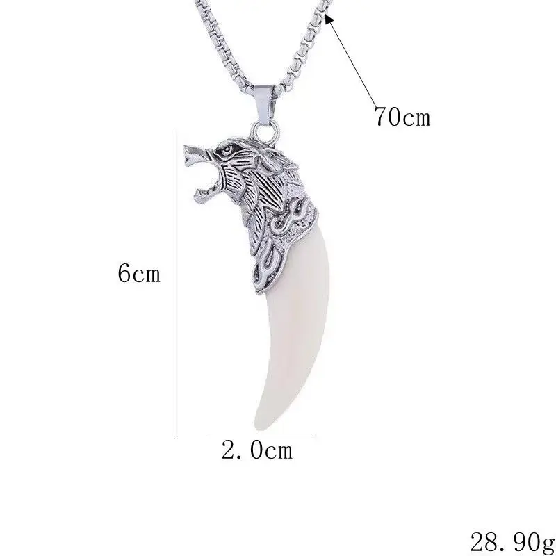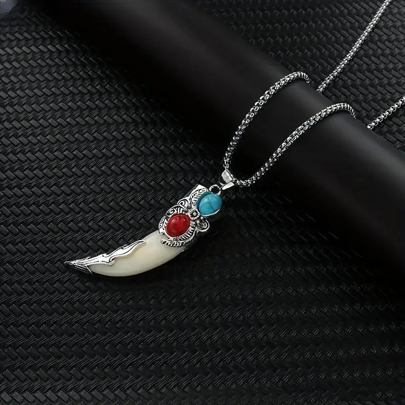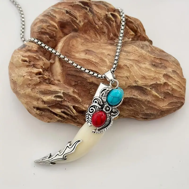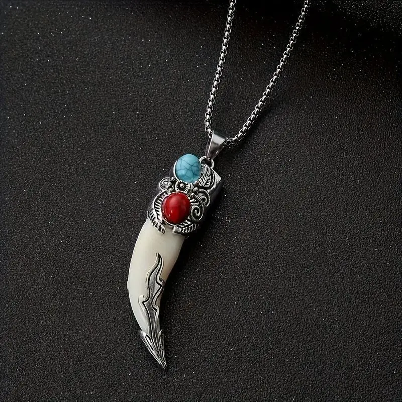 A vintage Bohemian style wolf tooth-shaped pendant necklace with turquoise inlay, suitable as a creative unisex gift for friends or as a Christmas present