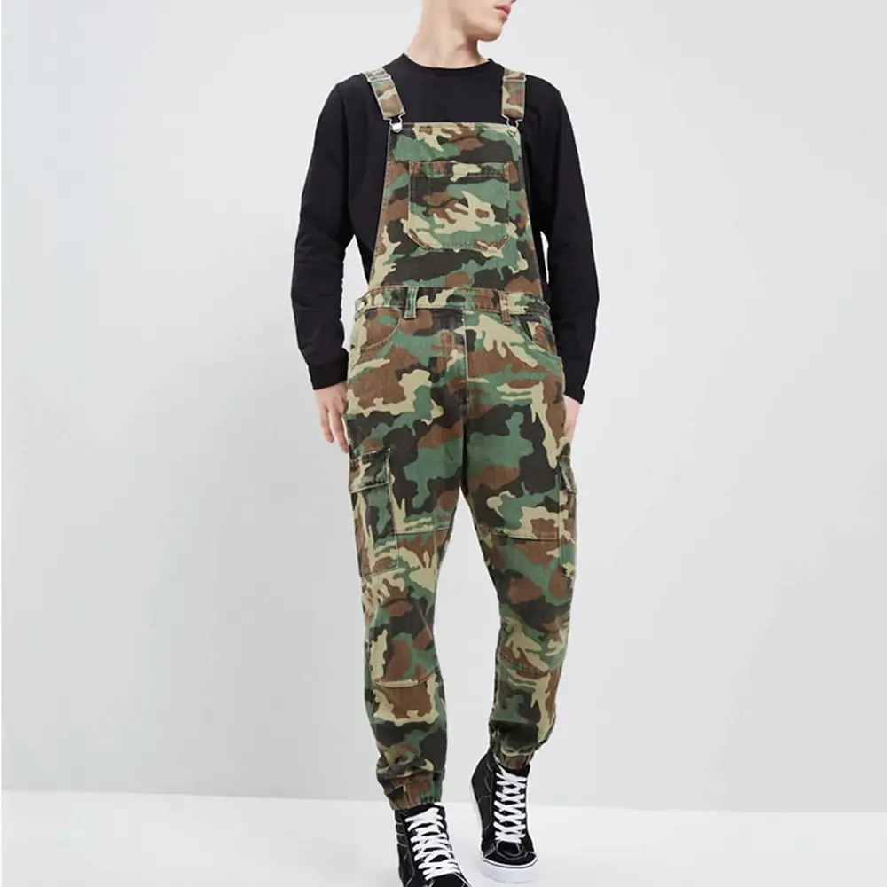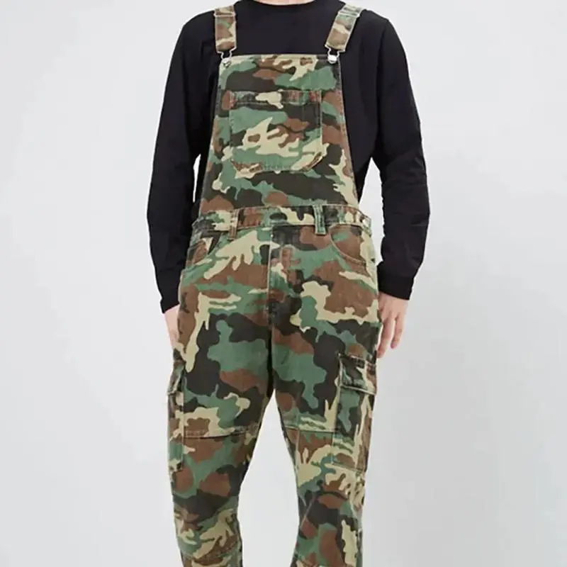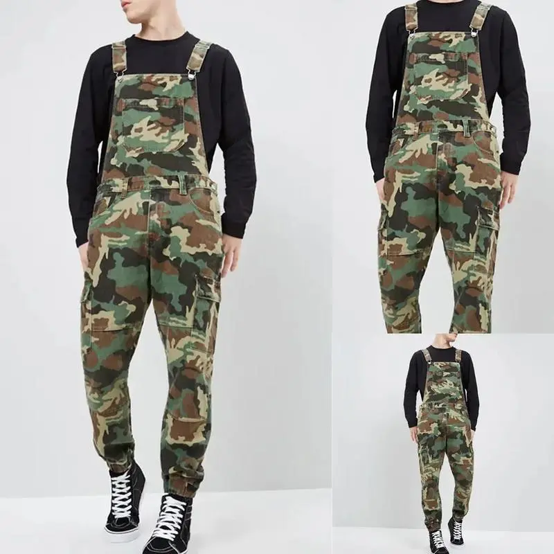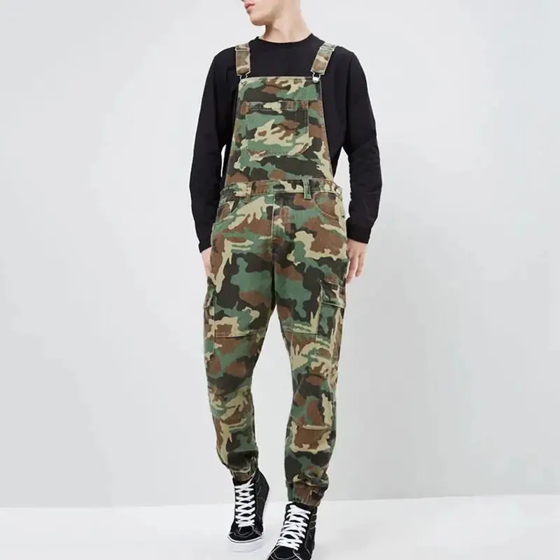 Men Jeans Print Denim Overalls Spliced Pockets Camouflage Pencil Pants Jumpsuits High Street Mid Waist Washing One Piece