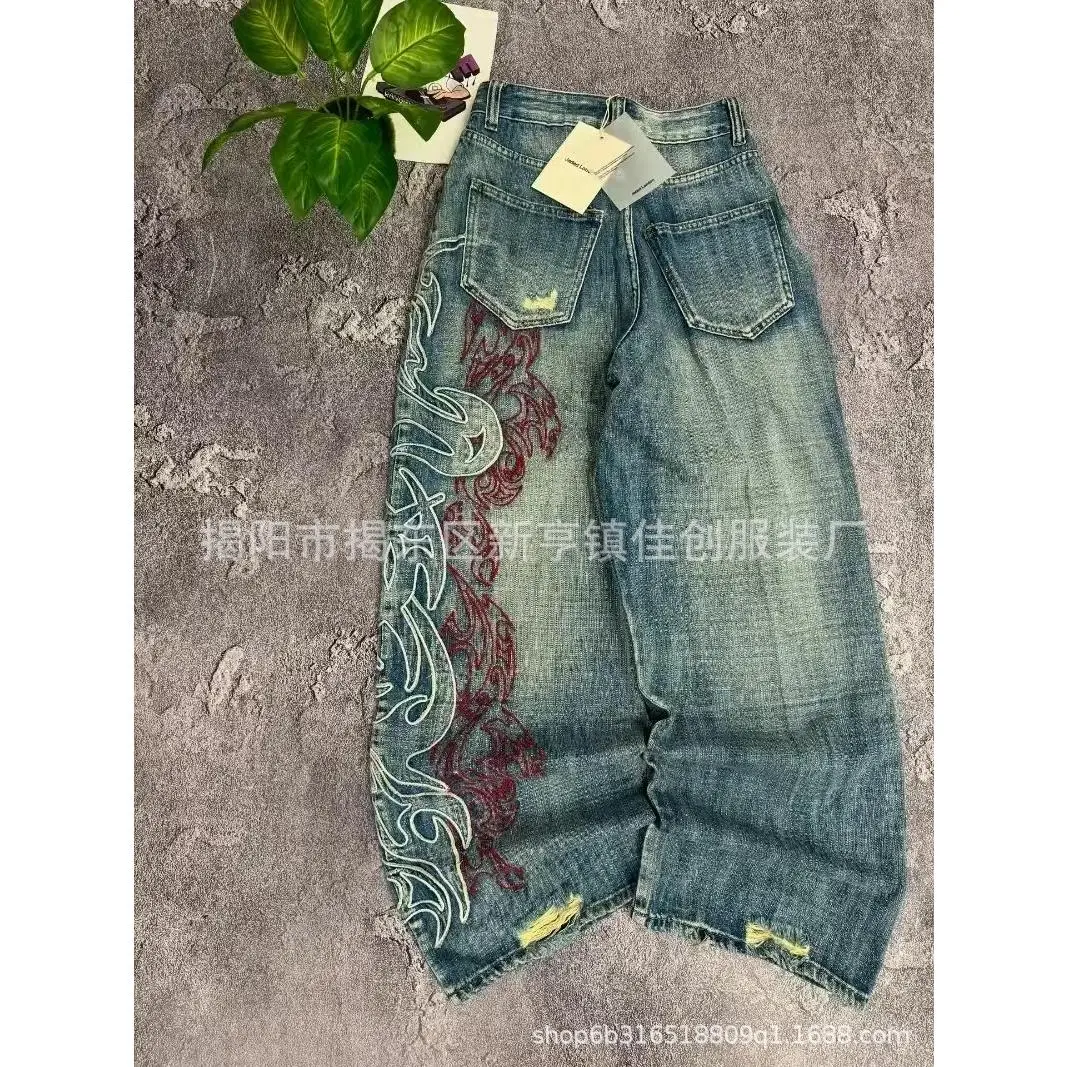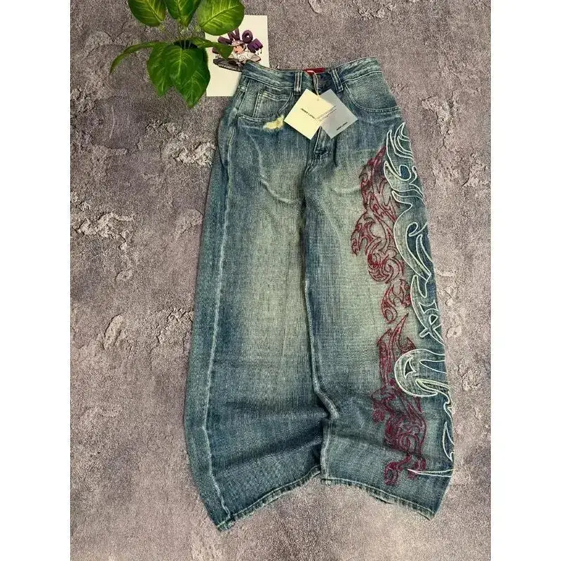 Y2K American New Pattern Embroidery Blacks Baggy Jean Boys Men High Street Vintage Hip Hop Fashion Casual Joker Couple Wide-leg