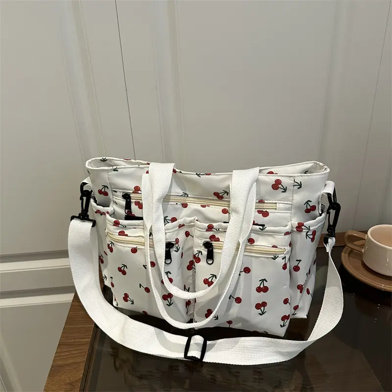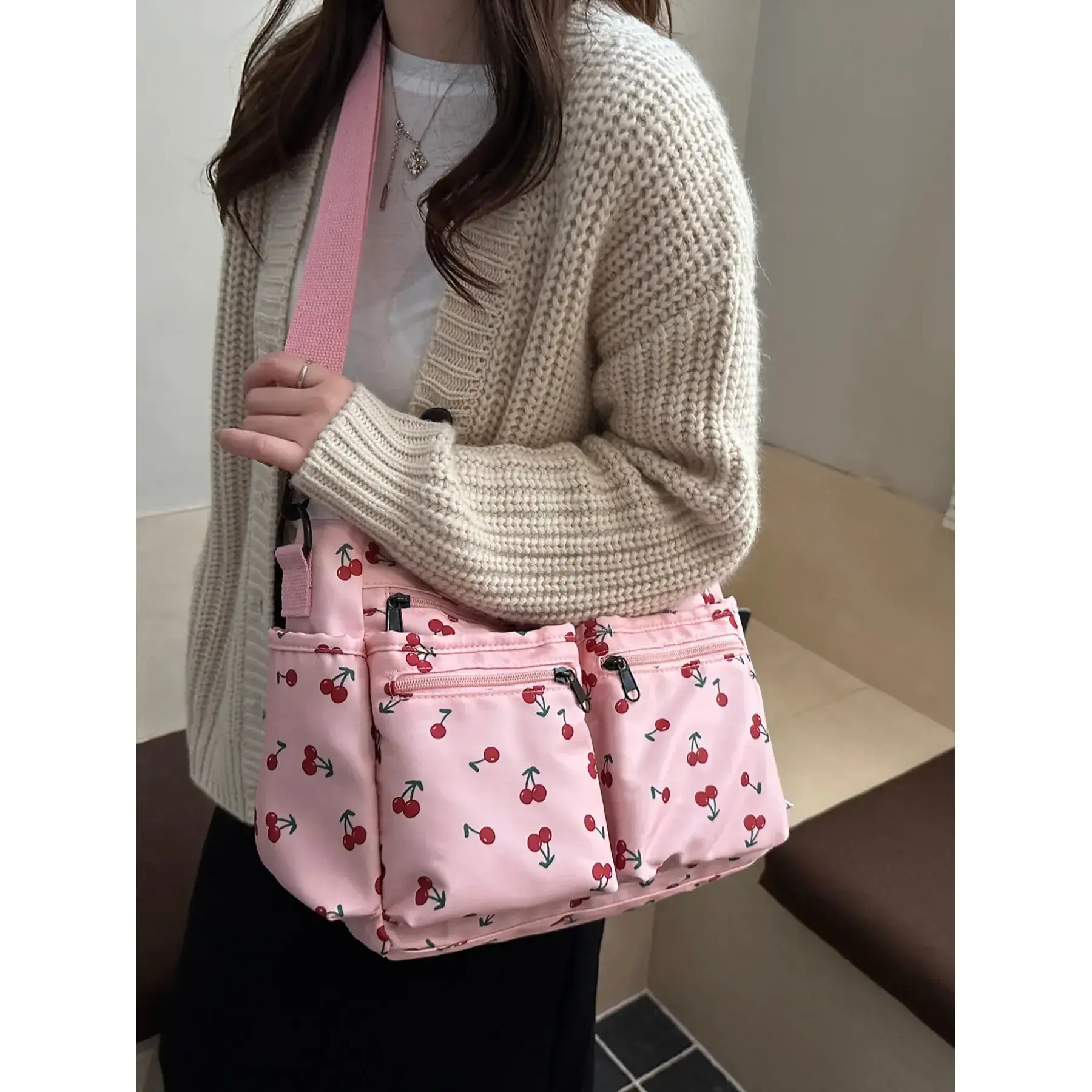 【Multipocket Organization】: Equipped with multiple pockets and a zipper design, facilitating easy access and organization of essentials while on the go. 【Adjustable Shoulder Strap】: Features an adjustable crossbody strap, allowing for personalized length and comfortable carrying options in various situations. 【Spacious Capacity】: Offers ample storage space, accommodating a tablet and daily necessities, perfect for outings or travel adventures. 【Water Bottle Side Pocket】: Includes a side pocket specifically designed to hold a water bottle or umbrella, enhancing convenience and utility. 【Unique Cherry Print】: Showcases a distinctive cherry print, adding a playful and fresh aesthetic compared to standard bag designs in the market.