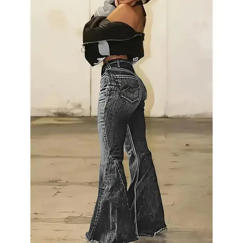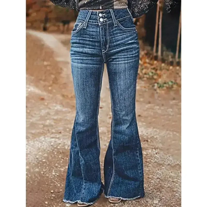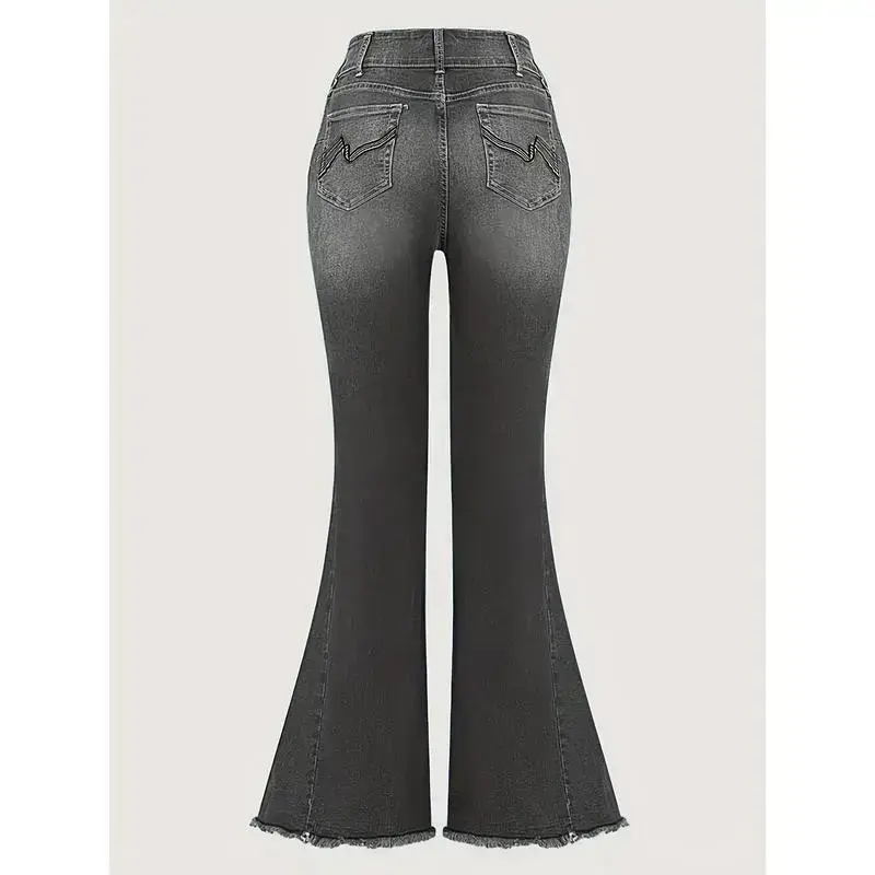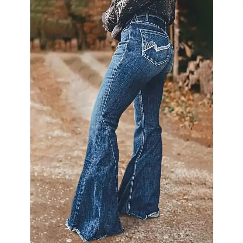 Women's Stretchy Denim Bell Bottom Jeans, Embroidered Flare Pants, Frayed Hem Jeans, Vintage Style For Fall Womenswear Leg Trouser Polyester