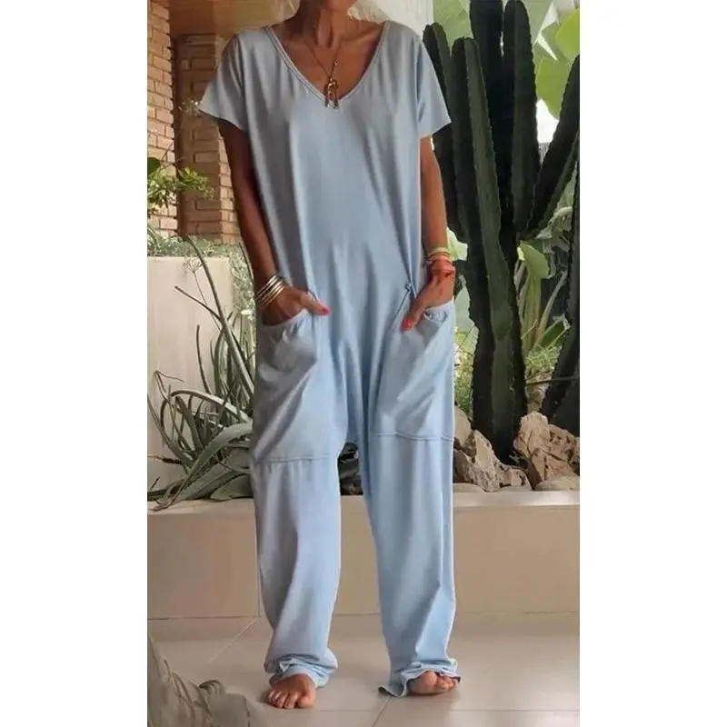 (New)Essential yellow loose V-neck pocket jumpsuit, made of soft and lightweight polyester fiber, suitable for spring and summer beaches and casual wear