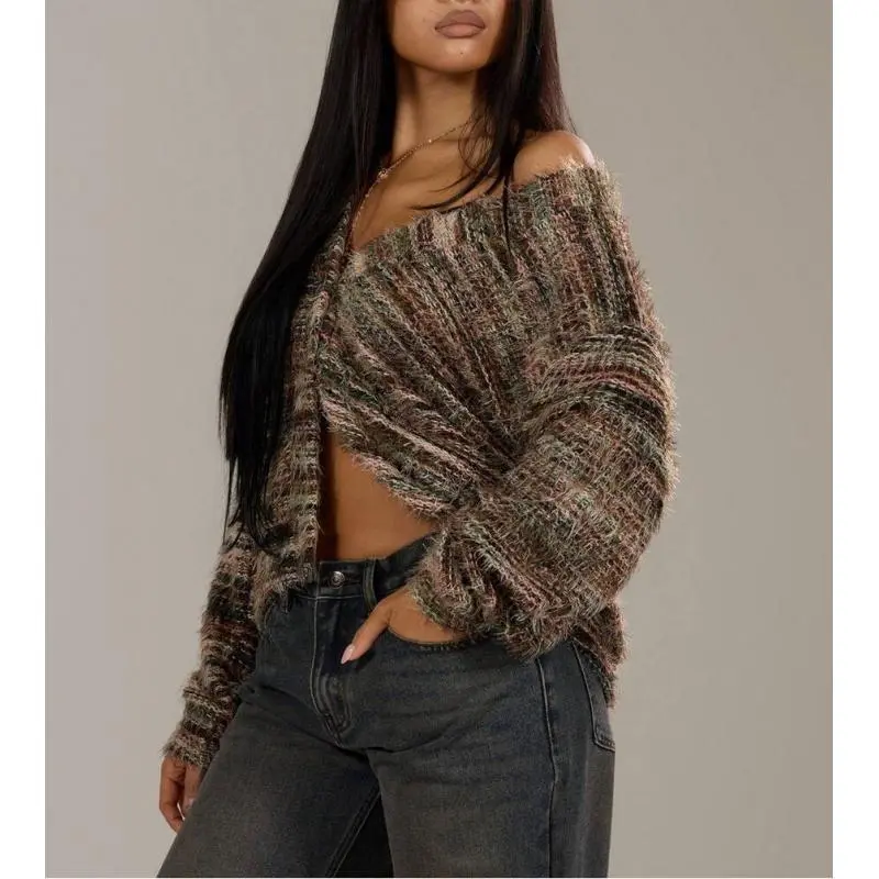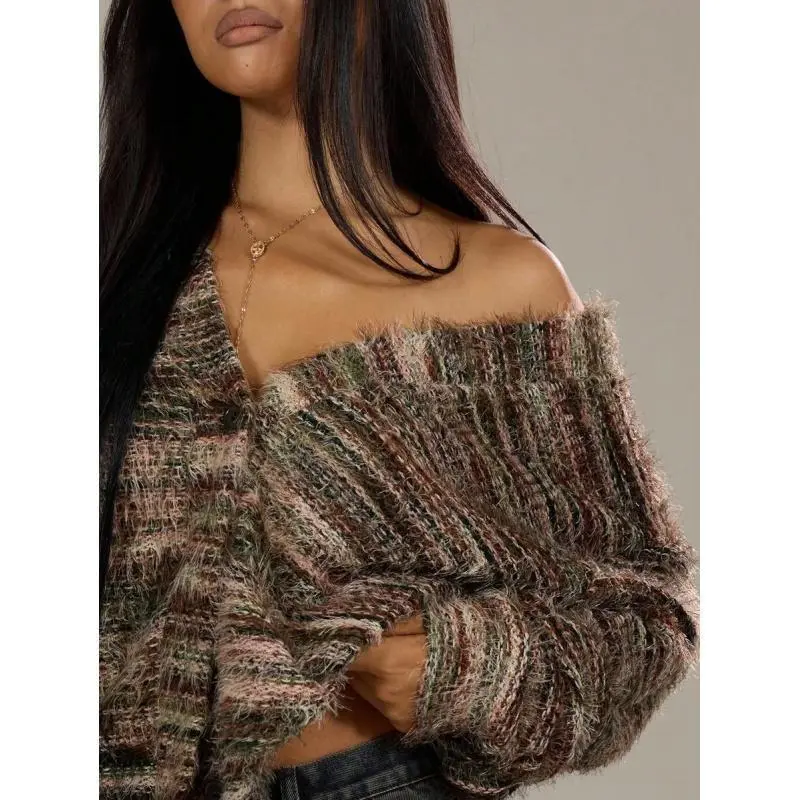 Neckline:V neck/Sleeve Type:Drop Shoulder/Hem Shaped:Regular/Pattern Type:Plain, Textured Pattern/Body:Unlined/Lined For Added Warmth:No/Color:Multicolor/Details:Button, Fuzzy/Style:Casual/Sleeve length: long sleeve/Length:Regular/Temperature:Spring/Fall (18-25 ��C/63-77 ��F)/Fit Type:Oversized/Fabric Elasticity:Slight Stretch/Material:Knitted Fabric/Composition:100% Polyester/Care Instructions:Hand wash or professional dry clean/Sheer:No