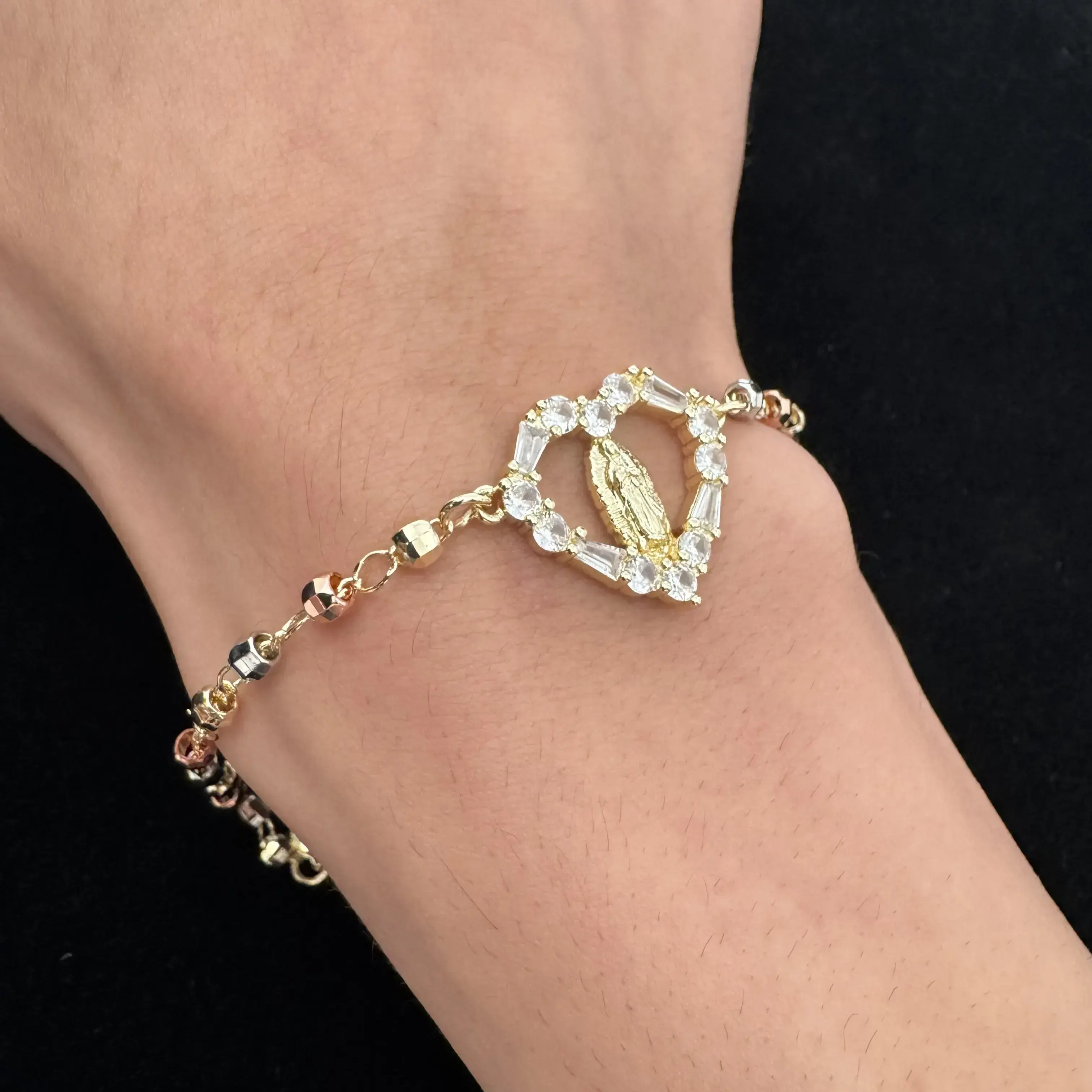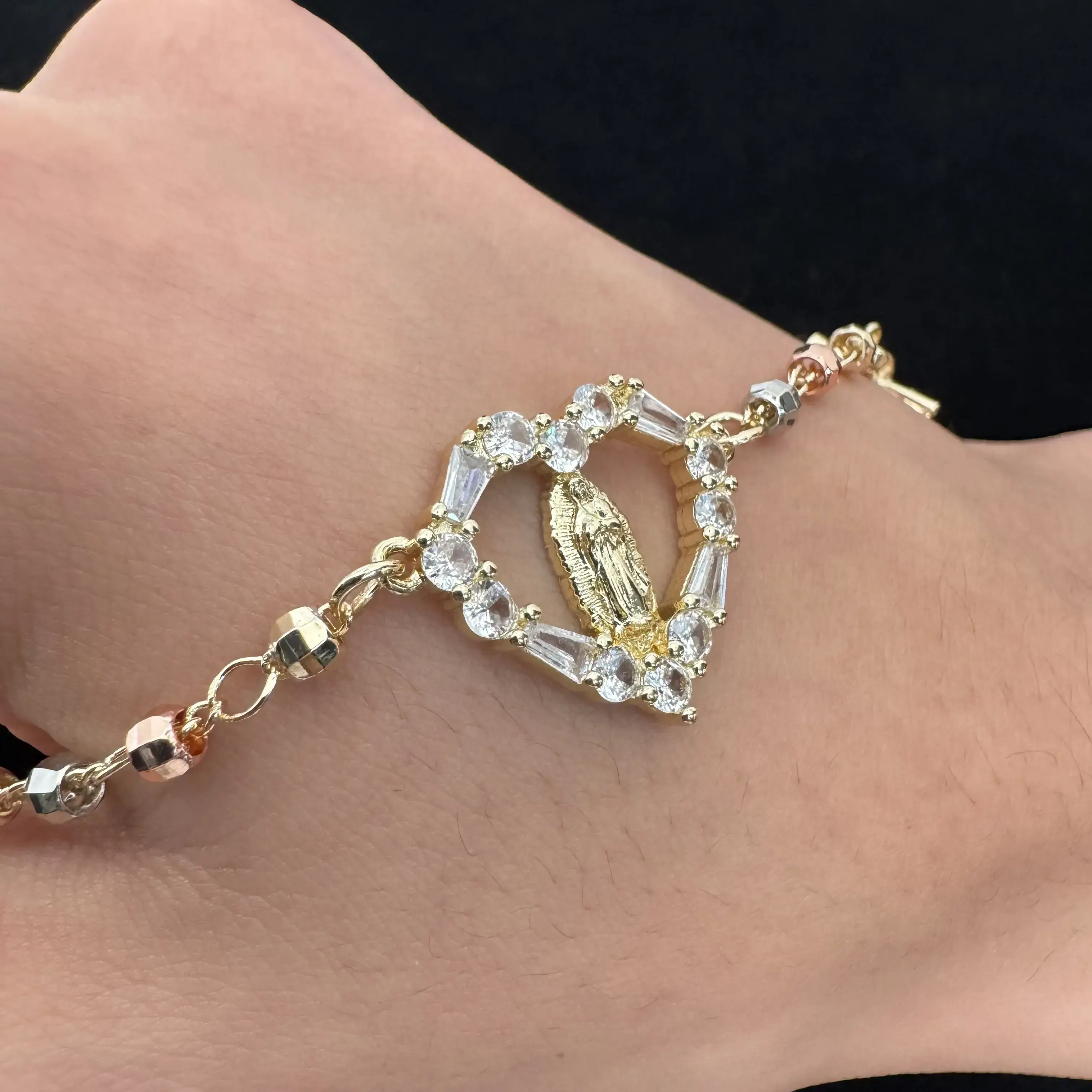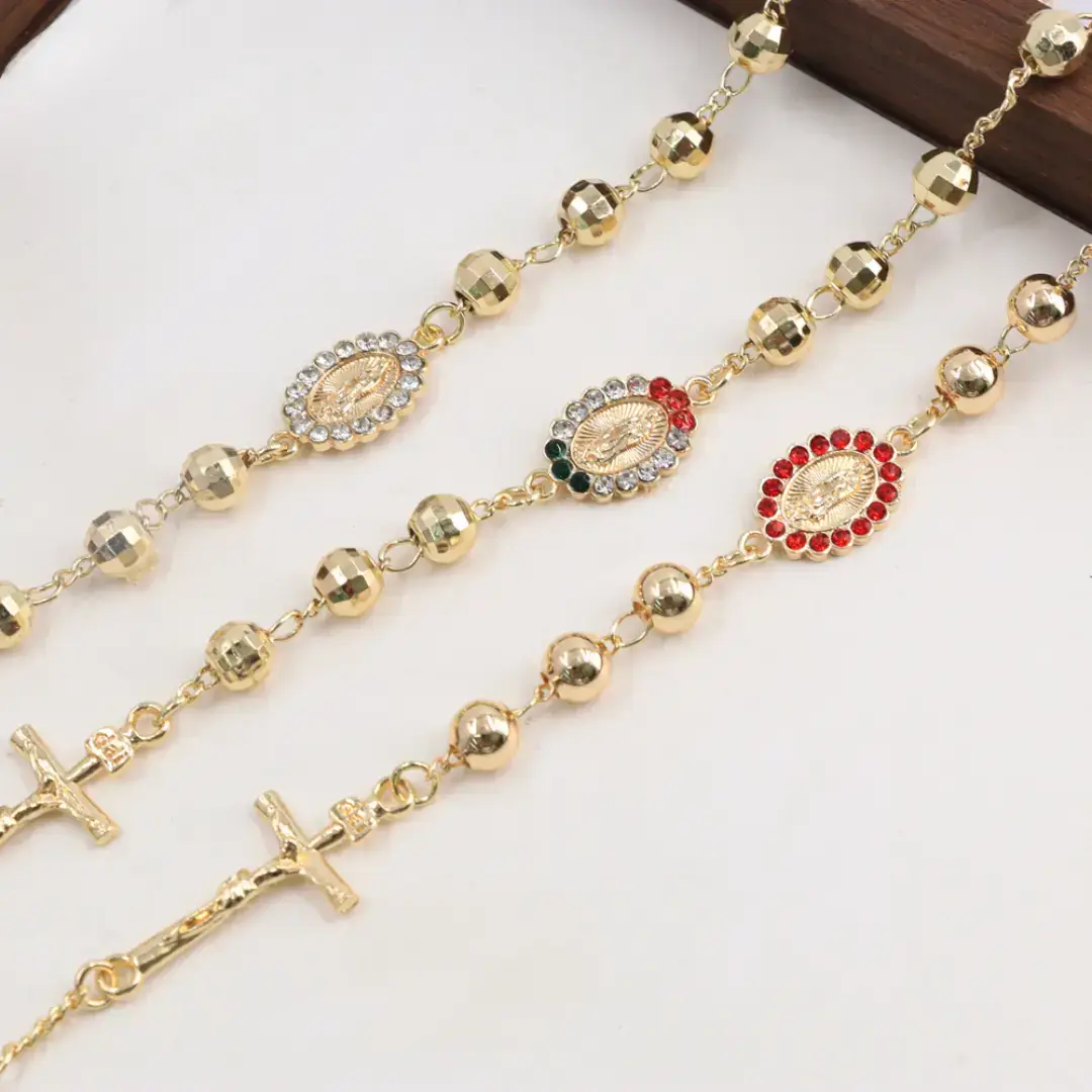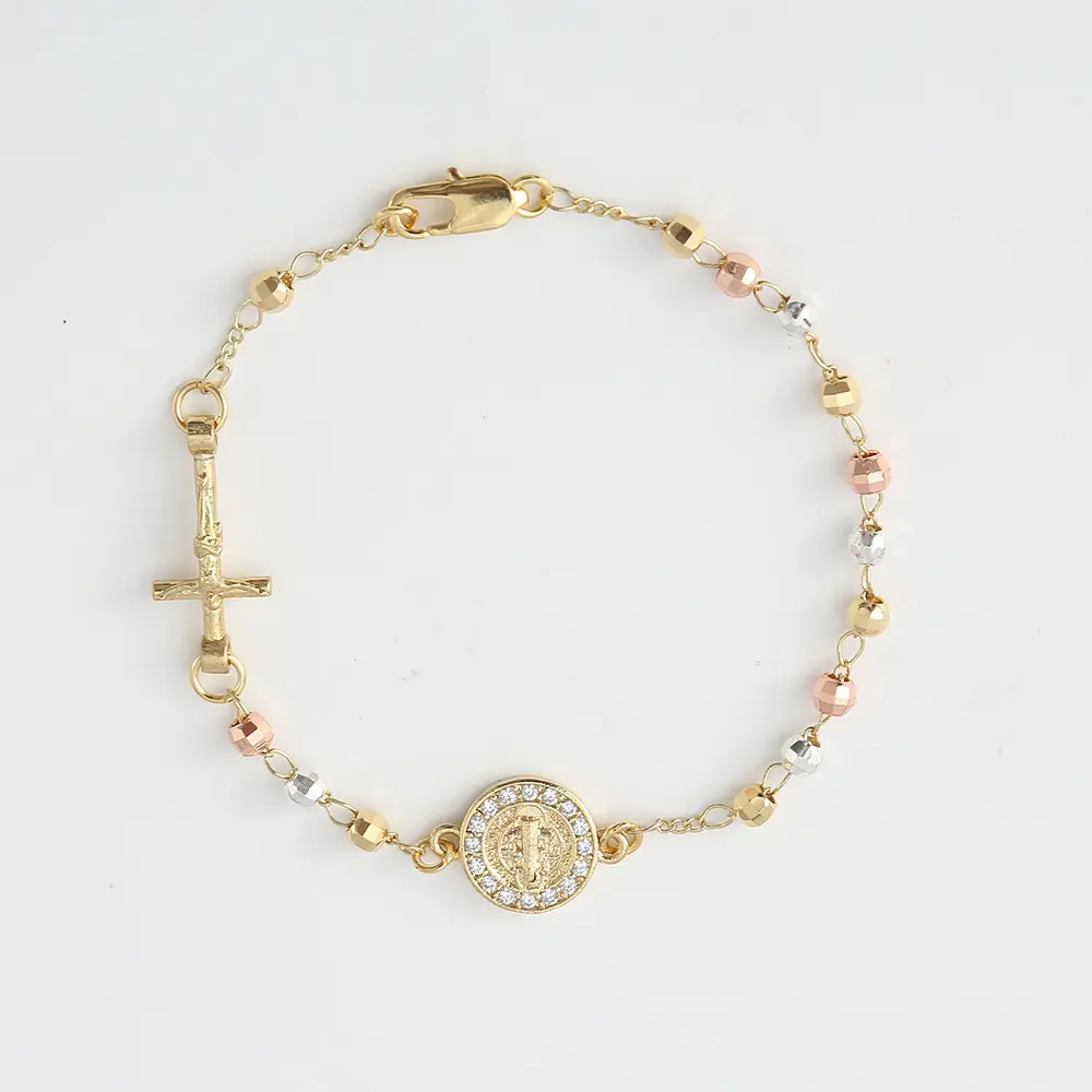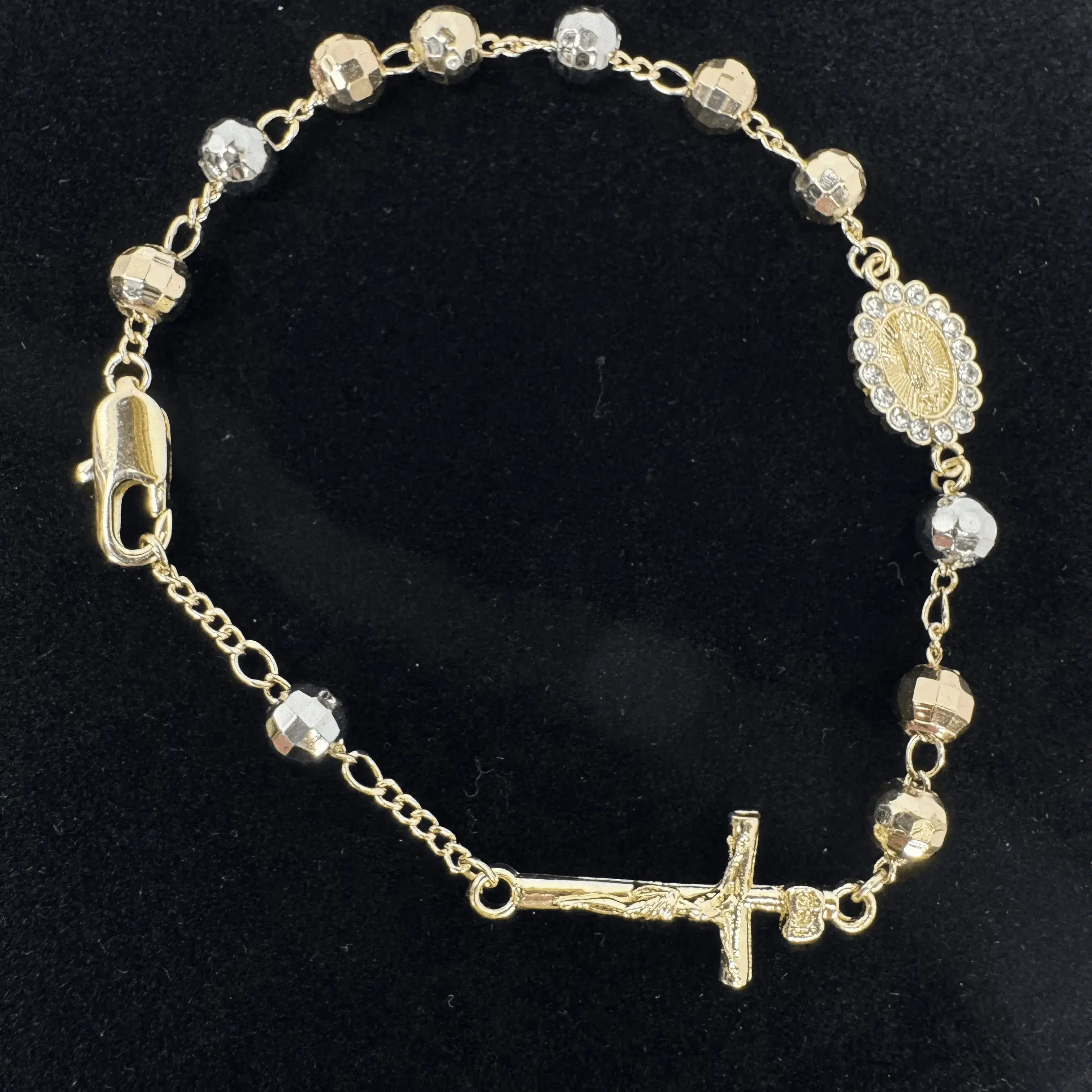 14K Gold Plated Diamond-Cut Beaded Rosary Religious Catholic Jesus Cross Bracelet Elevate your style with this exquisite 14K Gold Plated Diamond-Cut Beaded Rosary. This bracelet is designed to reflect your devotion and faith, making it a perfect accessory for any occasion. This bracelet is not just a piece of jewelry; it's a statement of faith and style. Whether you're attending a religious service or simply want to express your spirituality, this bracelet is the perfect choice. Size: 7" Base All our jewelry is made with quality Material 14k Gold plated with No fade Take a look at our Care guide on how to take care of your jewelry to last the longest!