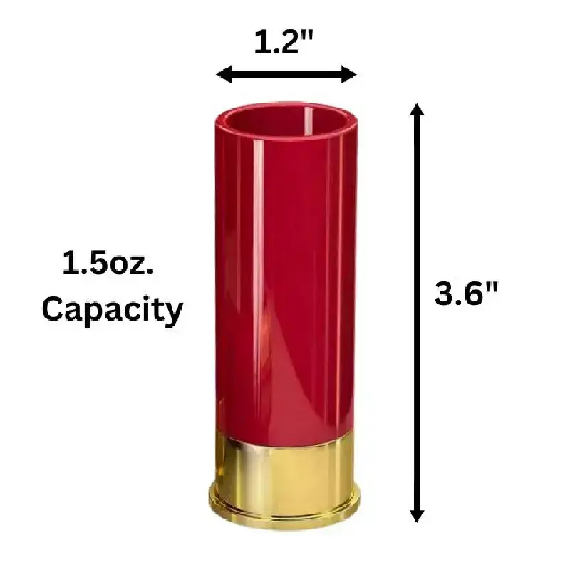 Elevate your barware with this unique set of 12 Gauge Shotgun Shot Glasses.Crafted from durable polyethylene, these shot glasses are designed to resemble authentic shotgun shells, adding a touch of charm to your drinking experience. Set of 4: This set includes four 1.5 oz shot glasses perfect for entertaining guests or enjoying a drink with friends. Unique Design: Each shot glass is shaped like a 12 gauge shotgun shell, making it a conversation starter at any gathering. Durable Material: Made from polyethylene, these shot glasses are shatterproof and reusable for long-lasting use. Ideal for various occasions such as groomsmen gifts, Christmas celebrations, Father's Day surprises, birthdays or simply enhancing your dining experience. The classic red and gold color combination adds an authentic touch to these shot glasses that are sure to stand out in any setting.