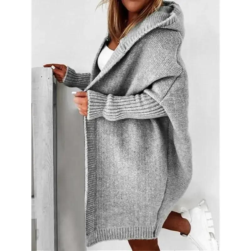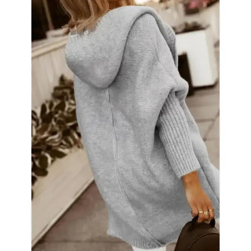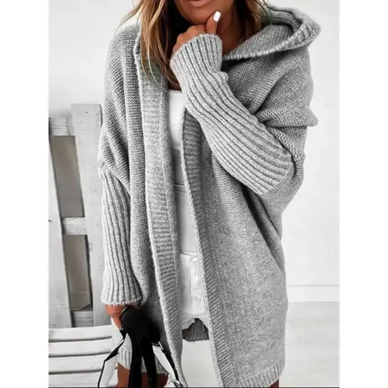Women's Knitted Solid Color Hoodie Cardigan, Casual Batwing Long Sleeve Sweater, Loose Fit Fall & Winter Fashion