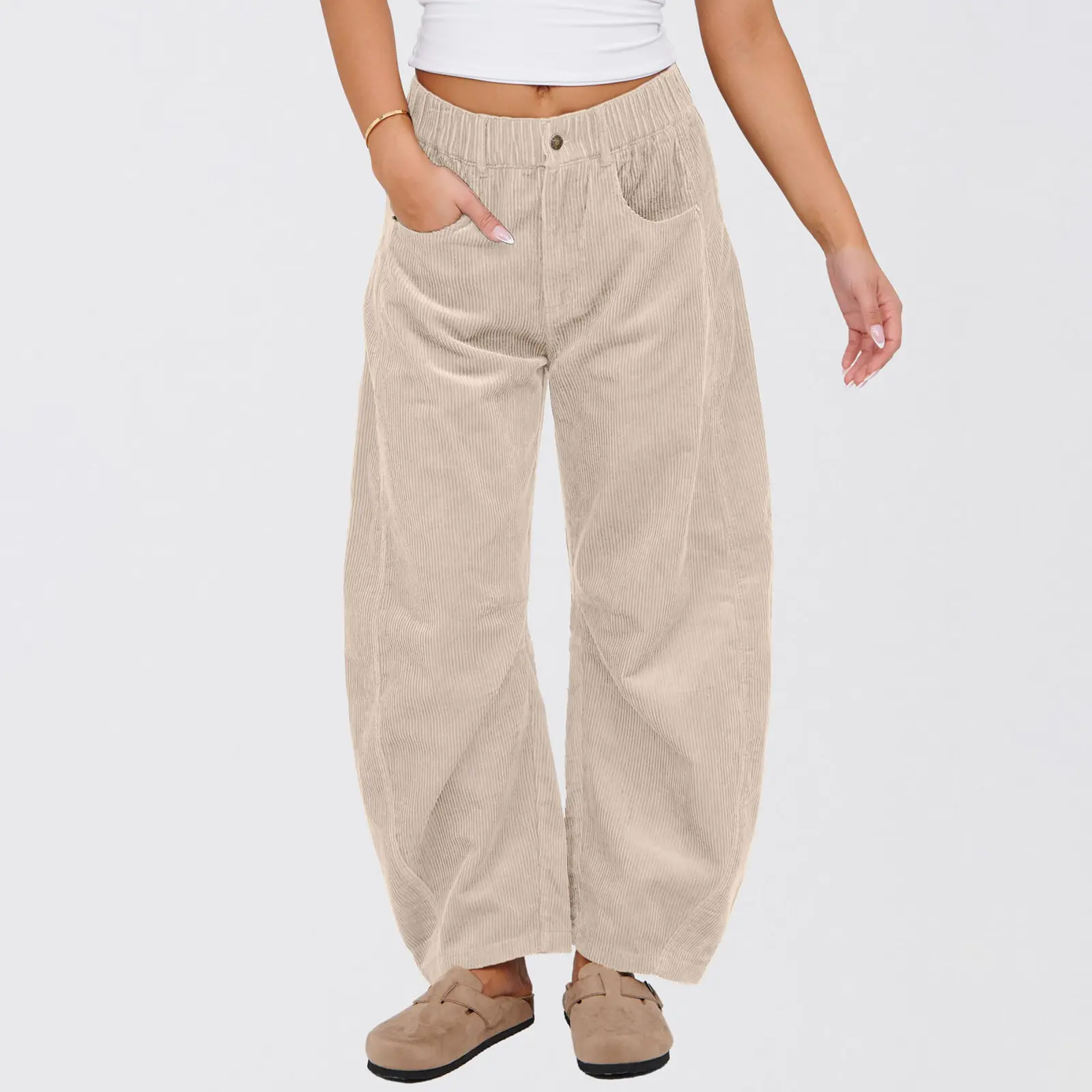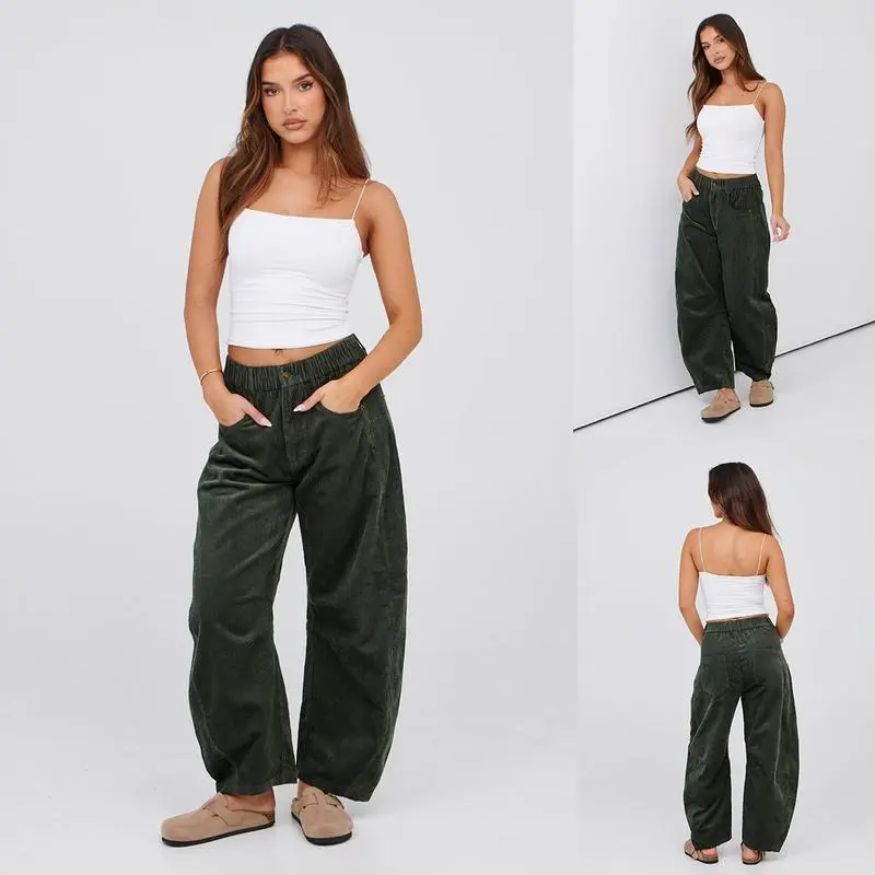 🌟 Kingapril Women's Corduroy Pants 🌟 Comfort & Style Combined These women's corduroy pants boast a comfortable elastic waistband and button closure. They feature a loose barrel leg design with seam detailing and belt loops at the waist. The four-pocket design adds functionality. Ideal for casual wear, these pants offer a relaxed fit, perfect for easy movement. 🧦 Breathable & Lightweight Fabric Made from textured corduroy fabric, these pants are breathable and lightweight. Perfect for fall, winter, and spring, they provide a stylish yet practical choice. The material ensures comfort throughout the day, making them a versatile addition to your wardrobe. 🍂 Versatile Design & Fit The mid-rise fit with wide legs tapering at the ankle offers ample room around the thighs and calves. This relaxed fit allows for easy movement and comfort. Pair these vintage barrel pants with various tops, undershirts, and shoes for a versatile look. A must-have for any wardrobe! 👖