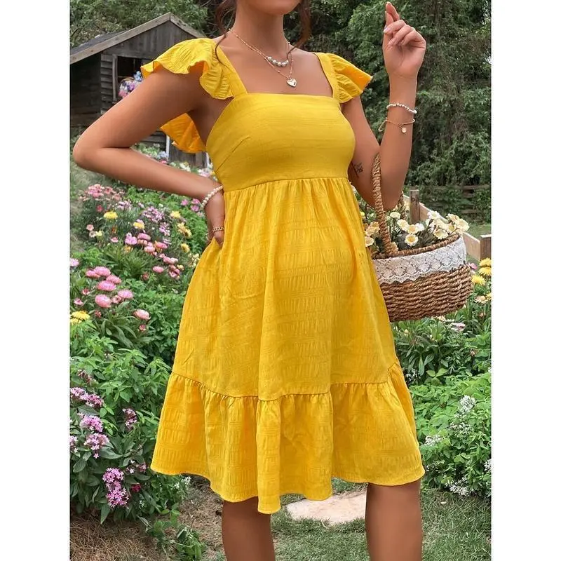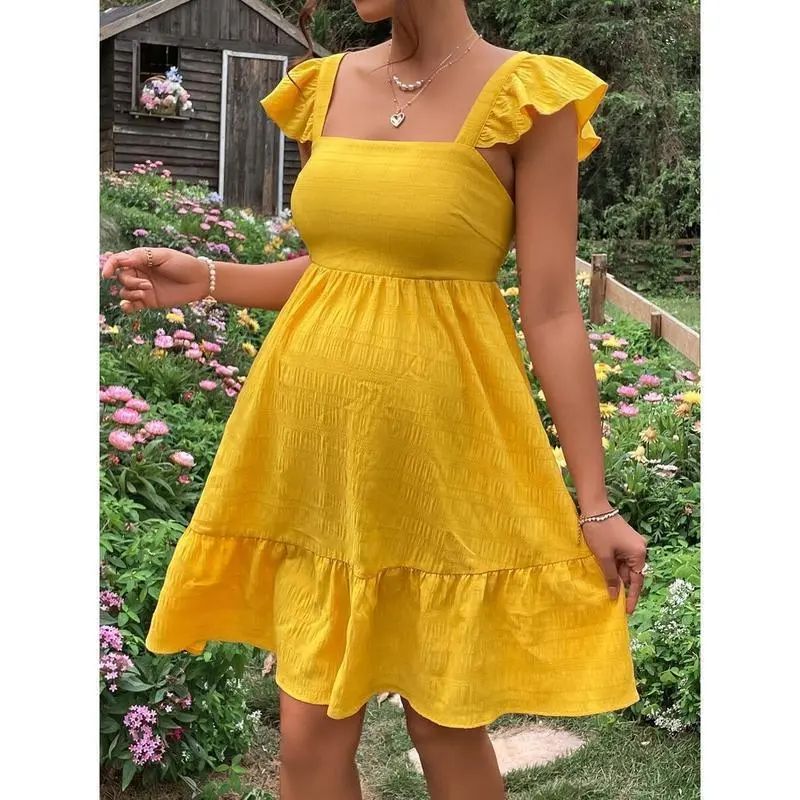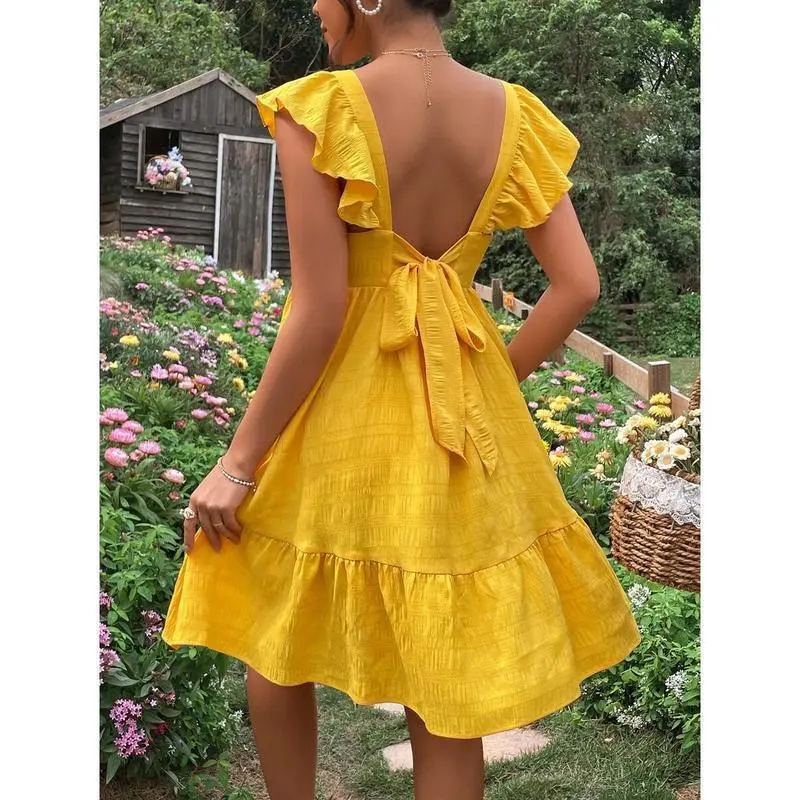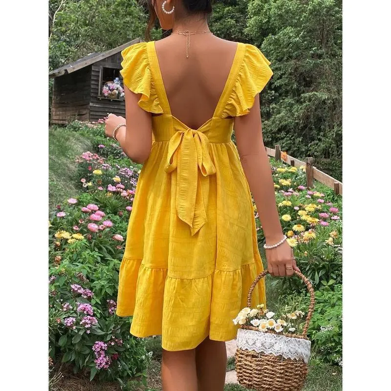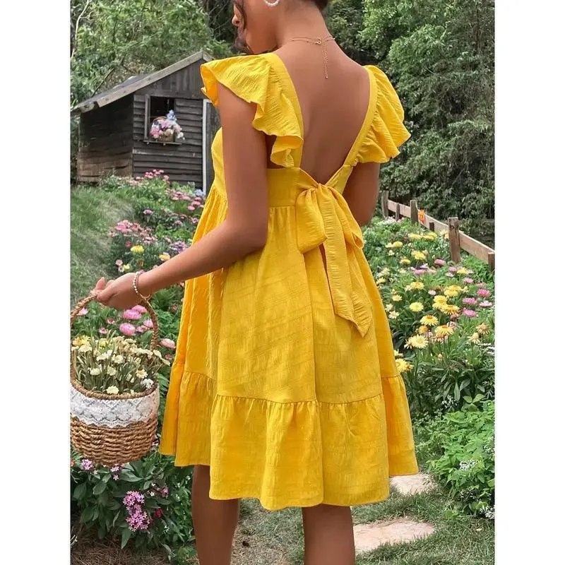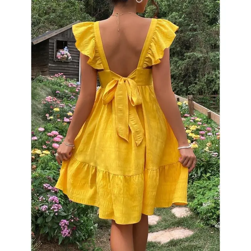 Neckline:Square Neck/Hem Shaped:Flounce/Waist Line:High Waist/Lined For Added Warmth:No/Pattern Type:Plain/Style:Boho/Body:Unlined/Type:A Line/Sleeve Type:Flounce Sleeve/Details:Ruffle, Backless, Ruffle Hem, Knot/Color:Yellow/Sleeve length: cap sleeve/Length:Short/Fit Type:Slim Fit/Fabric Elasticity:Non-Stretch/Material:Woven Fabric/Composition:99% Polyester, 1% Elastane/Care Instructions:Machine wash or professional dry clean/Sheer:Semi-Sheer