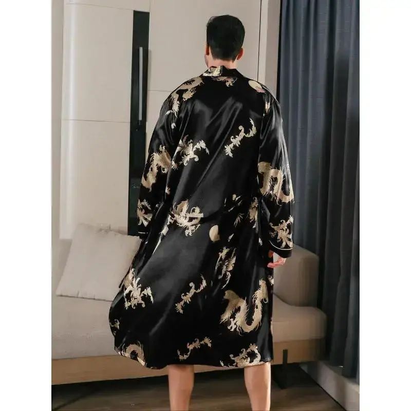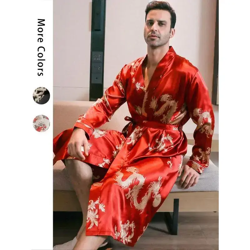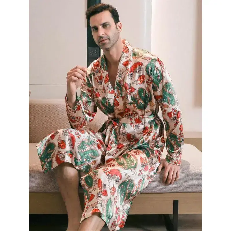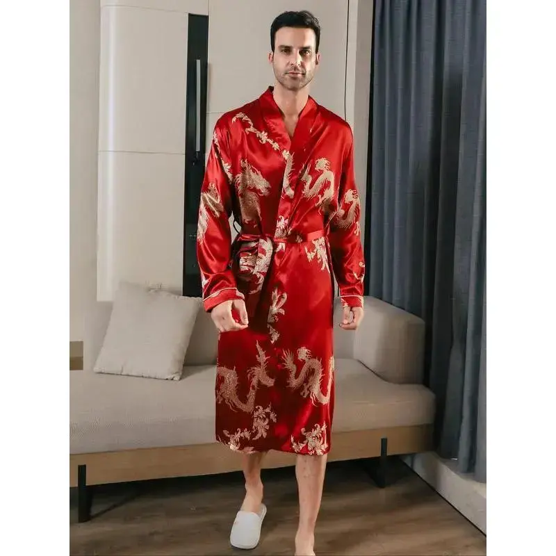 [Distinct Print]: Features an all-over dragon print that adds a unique cultural flair to your sleepwear collection. [Lightweight Fabric]: Crafted from satin, offering a smooth and cooling sensation against your skin, perfect for warm summer nights. [Belted Fit]: Comes with a waist belt that allows for an adjustable fit, ensuring comfort while maintaining a structured look. [Long Sleeves]: Designed with long sleeves that provide extra coverage and warmth, making it suitable for transitional seasons.