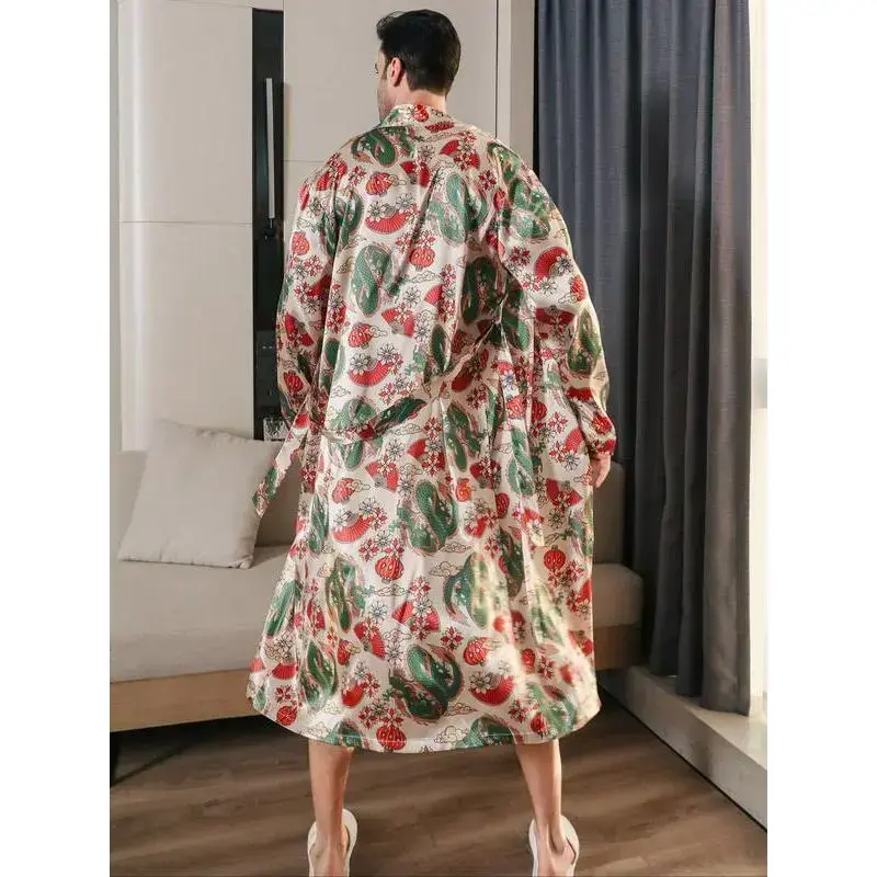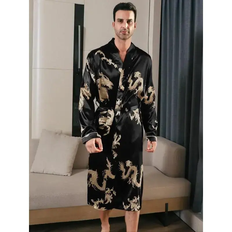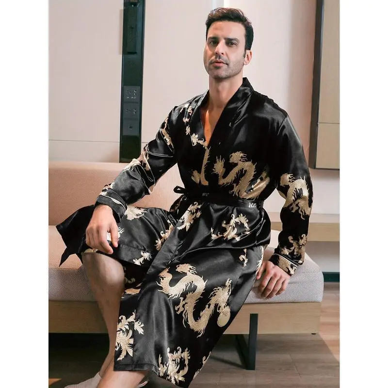 Men's All Over Dragon Print Satin Robe with Waist Belt Design, Regular Fit Long Sleeve Shawl Collar Dressing Gown, Summer Men's Sleepwear Menswear Loungewear
