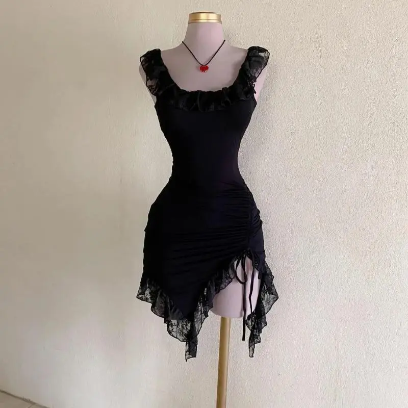 Rave outfits 2025 European And American Women's Clothing Summer New Lace Round Neck Sleeveless Dress Hem Casual Elegant Black Fabric