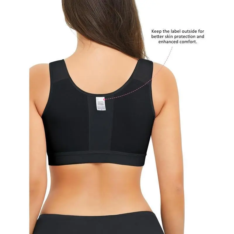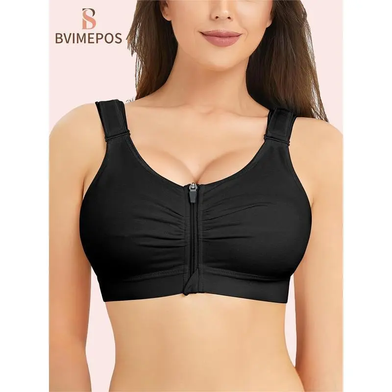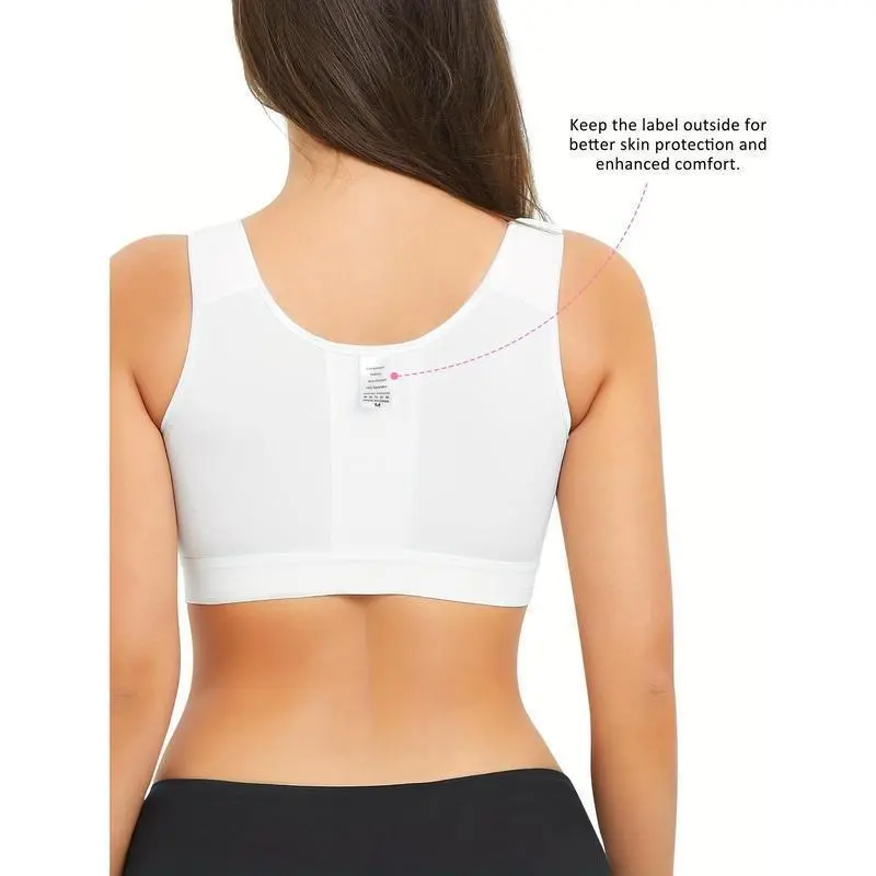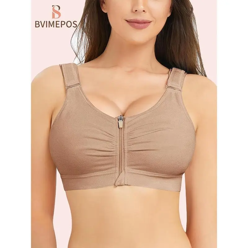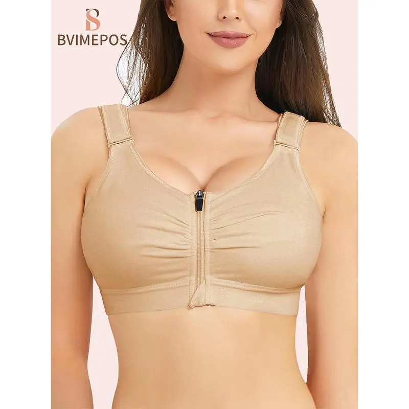 [Post-Surgery Compression Bra] Wireless Full Coverage Women's Post-Surgery Zip-Front Compression Bra - Adjustable Straps, 84% Cotton 16% Spandex, Beige, Ideal for Daily Wear, Yoga & Exercise