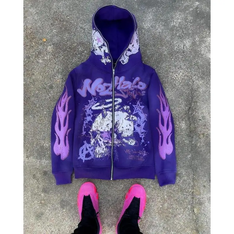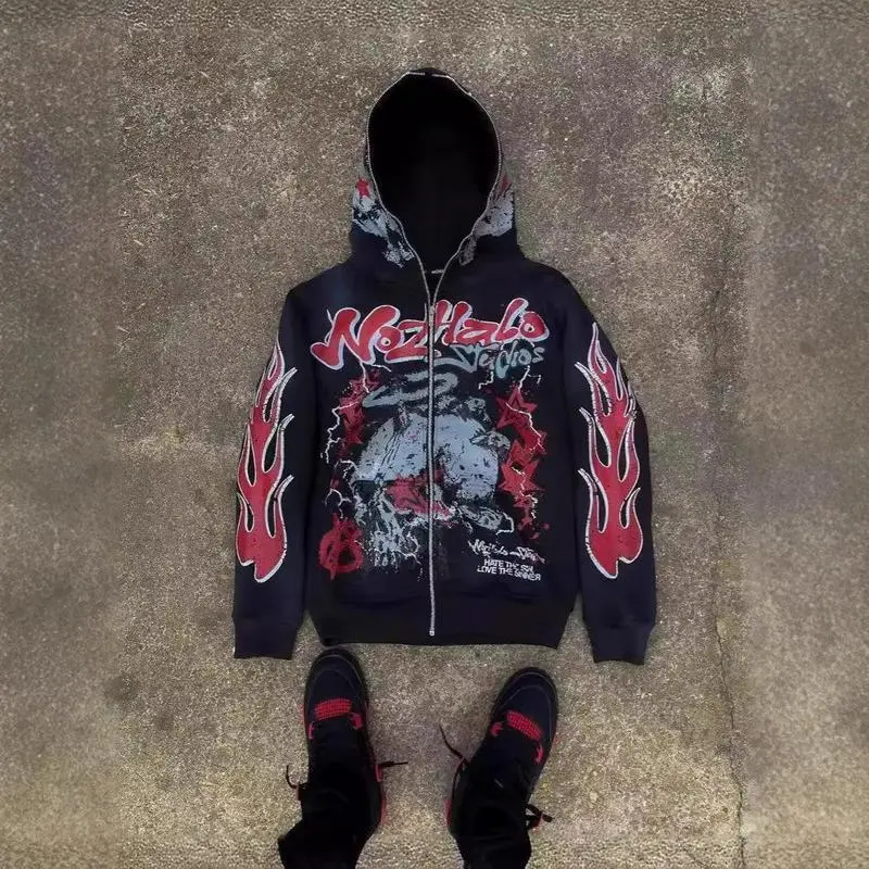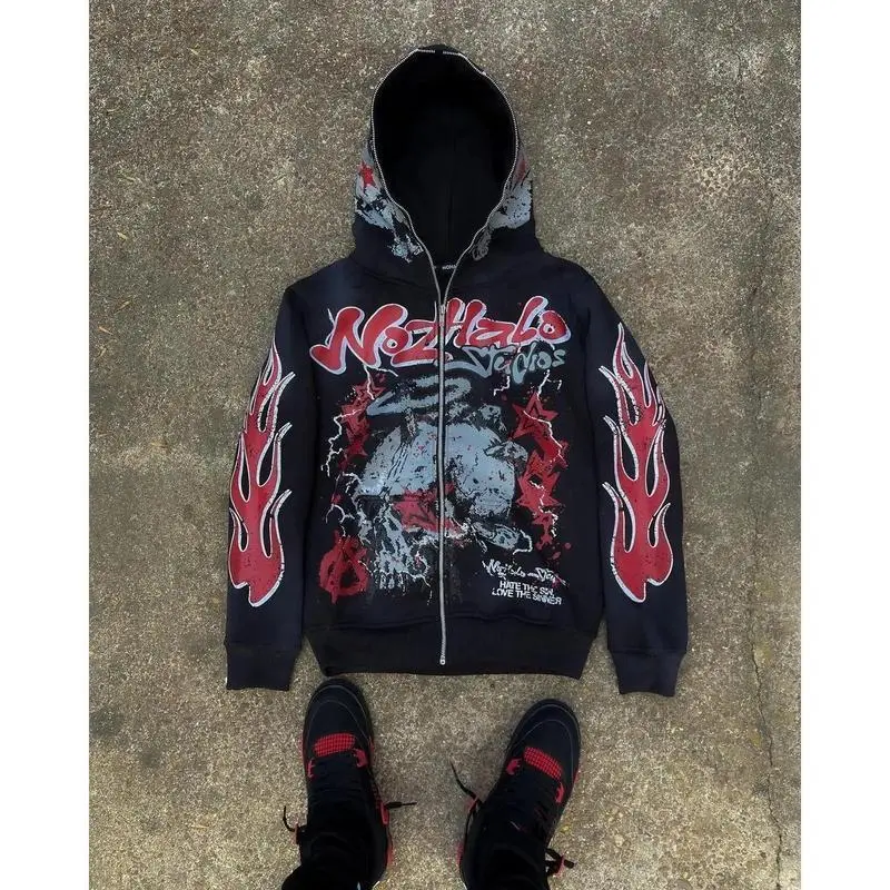 Y2K Streetwear Zip Hoodie �C Vintage Harajuku Cartoon Print Oversized Sweatshirt