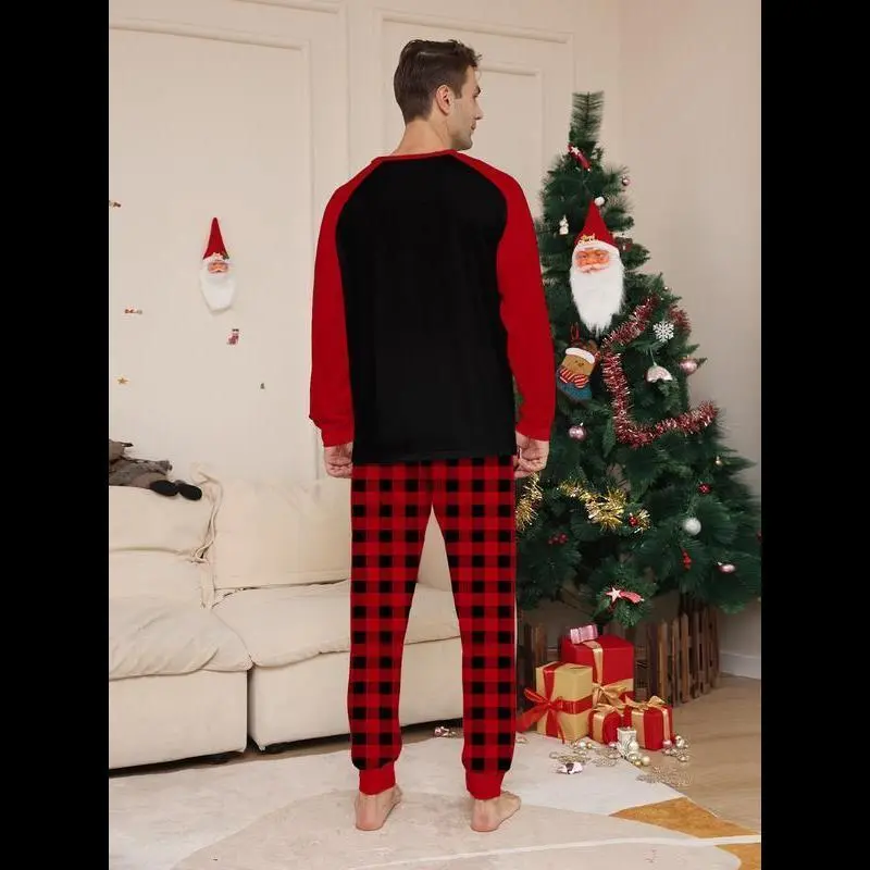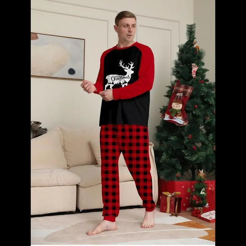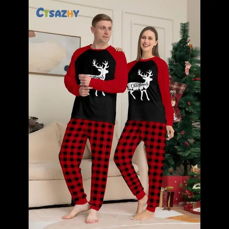 Christmas Couple Pajamas Set, Reindeer Print Top & Plaid Pants, Casual Fall Winter Home Wear, Comfortable Daily Sleepwear