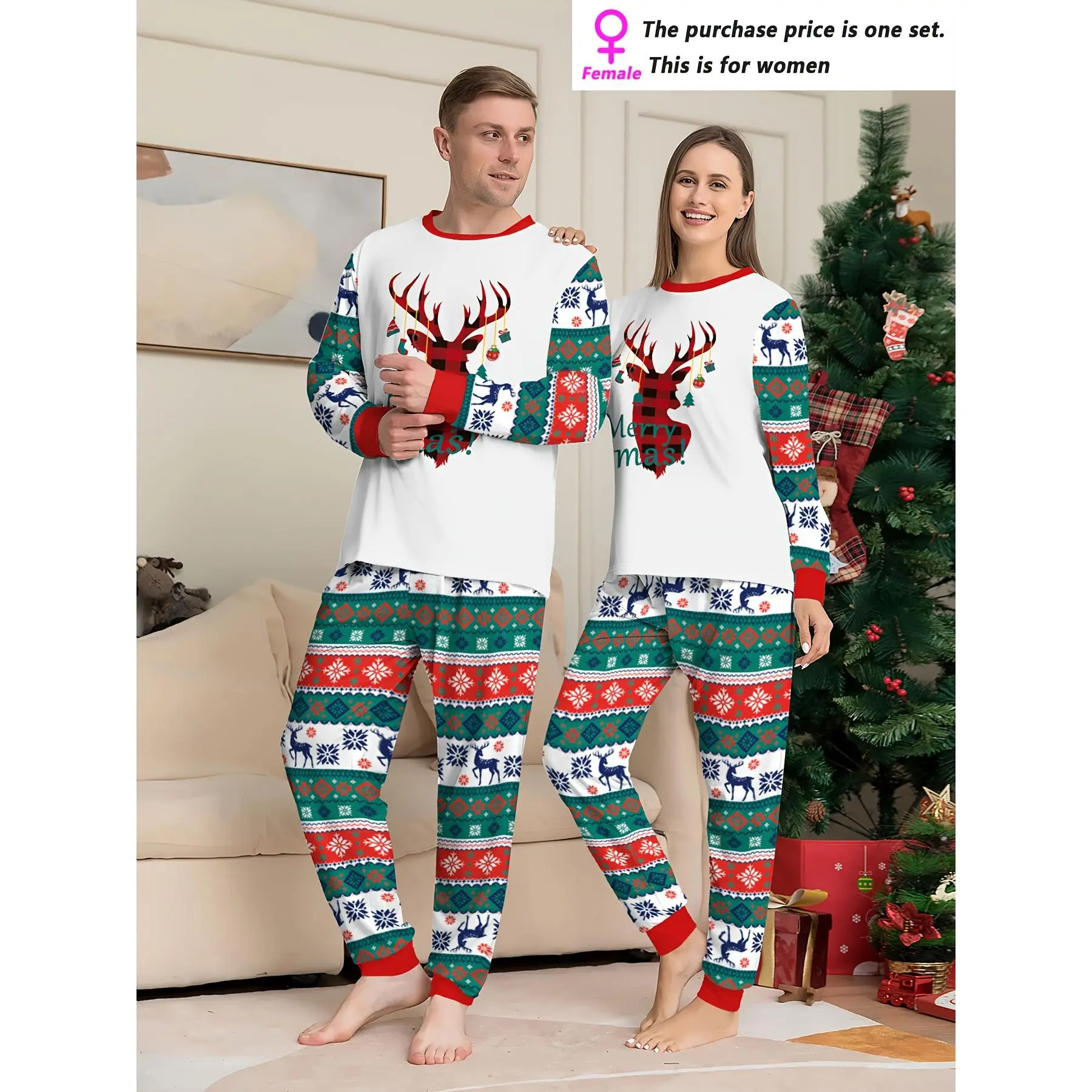 【Festive motif】: Features a charming white reindeer print, adding a delightful holiday spirit to your loungewear collection./【Seasonal wear】: Designed specifically for fall and winter, this set keeps you cozy during the colder months at home./【Moderate thickness】: The fabric's moderate thickness offers warmth without being too heavy, ensuring you stay at ease all day./【Fitted silhouette】: The fitted structure provides a flattering look while allowing for comfortable movement, perfect for relaxing at home./【Knit fabric】: Crafted from soft knit material, this pajama set is gentle on the skin, enhancing your relaxing evenings.