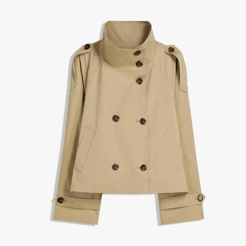 Women's Khaki Cropped Trench Coat Double Breasted Short Jacket High Collar Fitted Long Sleeve Belted Autumn Winter Coats Trendy Outfit Can be used with raincoat