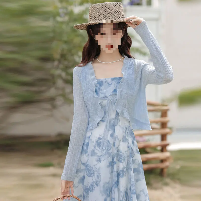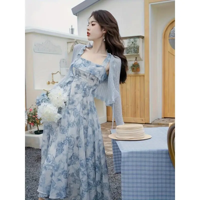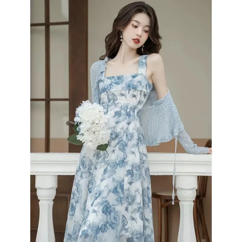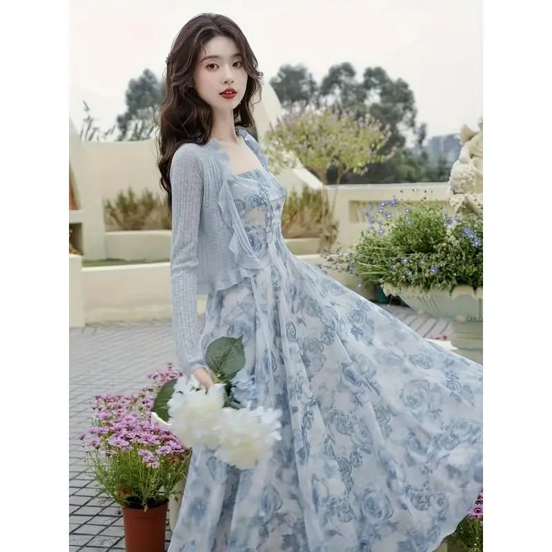 Long Sleeve Elegant Floral Print Strap Dress Set with Ruffle Trim Open Front Ribbed Cardigan & Square Neck Sleeveless A-line Dress Outfits, Women's Clothing