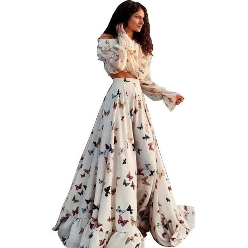European and American Cross-Border Internet Celebrity Butterfly Print Two-Piece Bohemian Large Hem Long Skirt Beach Dress Summer White