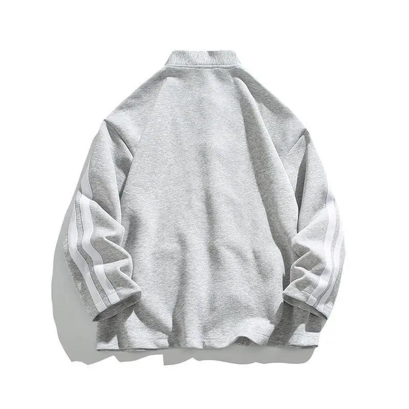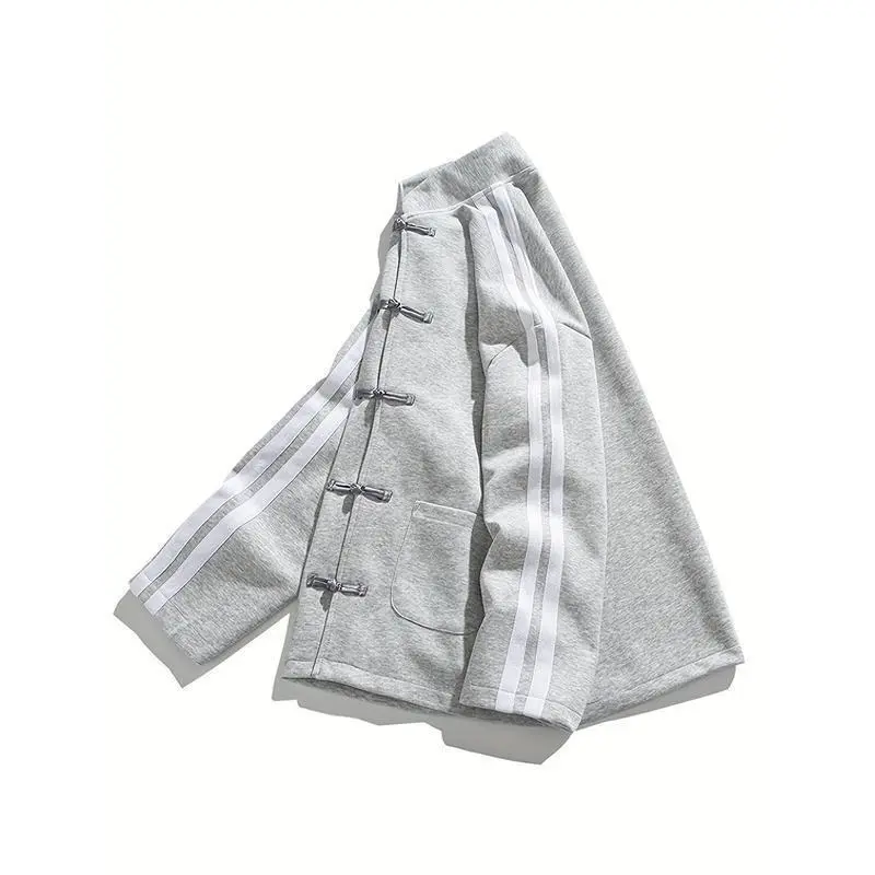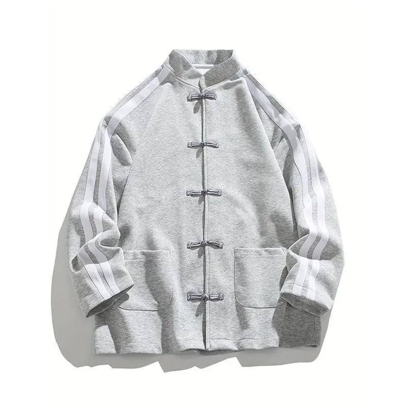 🌟 Chinese Style Button Cardigan Design 🌟 This heavyweight sweatshirt features a loose, trendy top coat design. Perfect for couples, it's a new men's clothing piece. The menswear jackets come in black and light gray. Ideal for casual wear, these striped fashion tops are versatile outerwear. 📌 Size Options 📏 Choose from a range of sizes: XS, S, M, L, XL, XXL. This ensures a comfortable fit for all. The cardigan design adds a stylish touch to your outfit. 📌 Key Features 📝