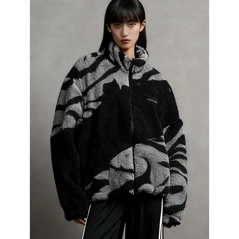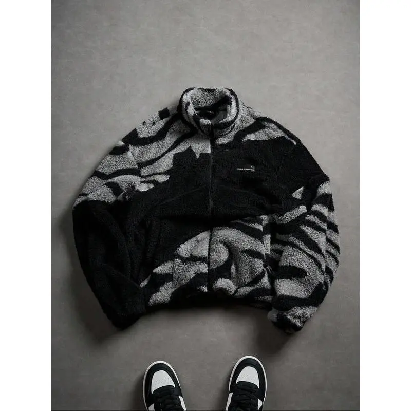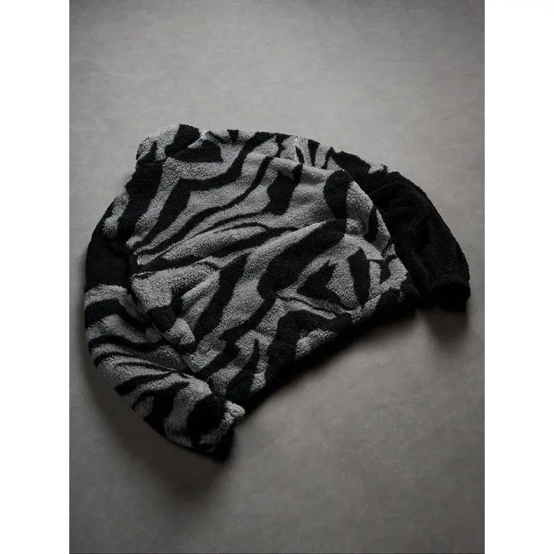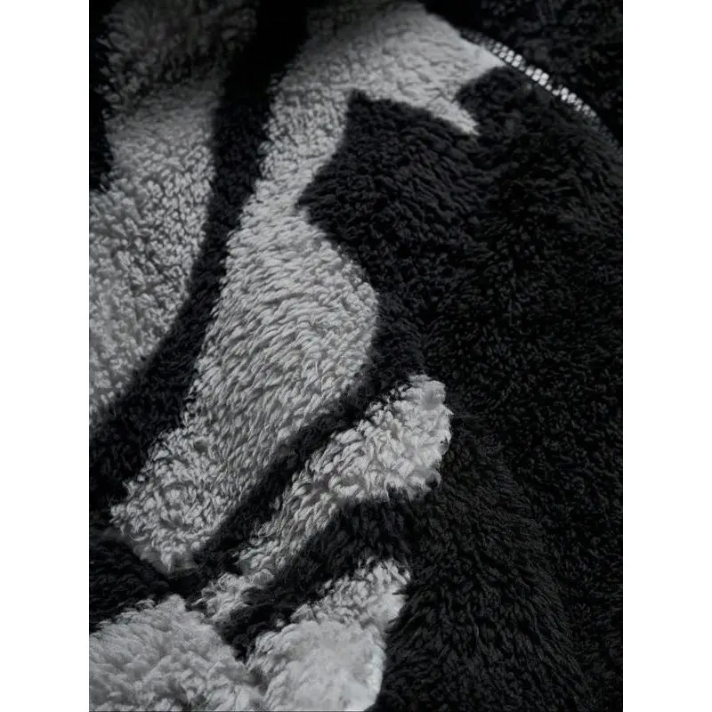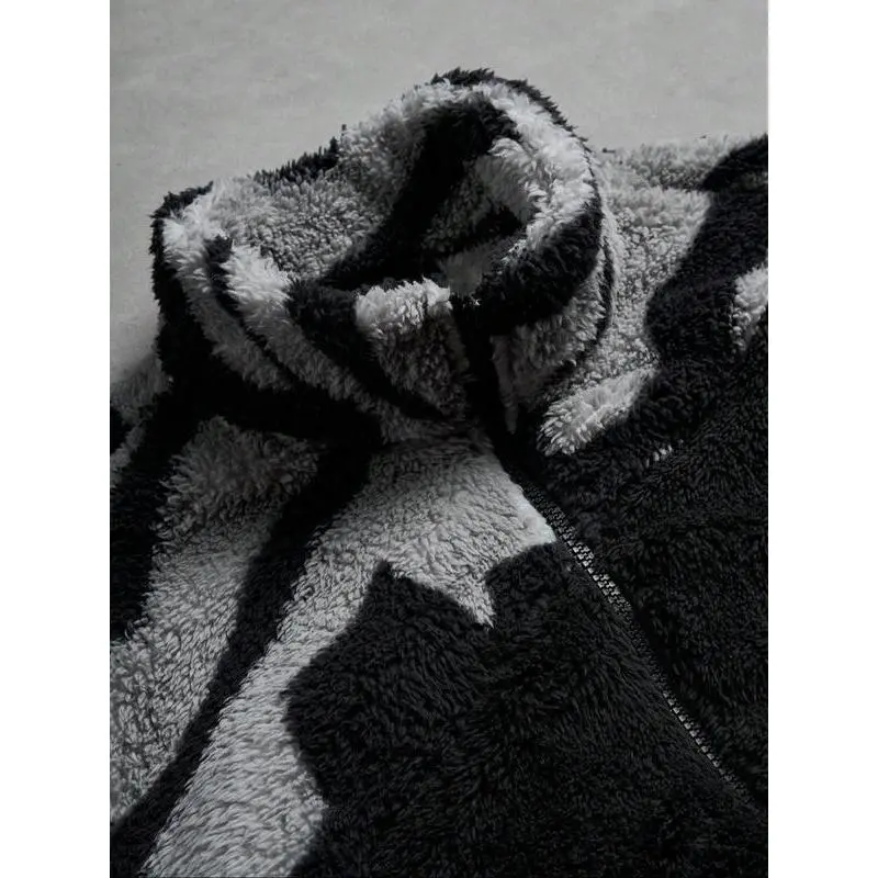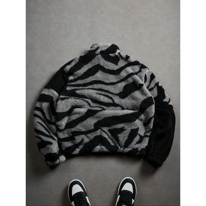Men's Street Zebra Fleece Jacket, Camo Style, Lamb Fur Material, Warm Casual Fit, Fall & Winter Streetwear