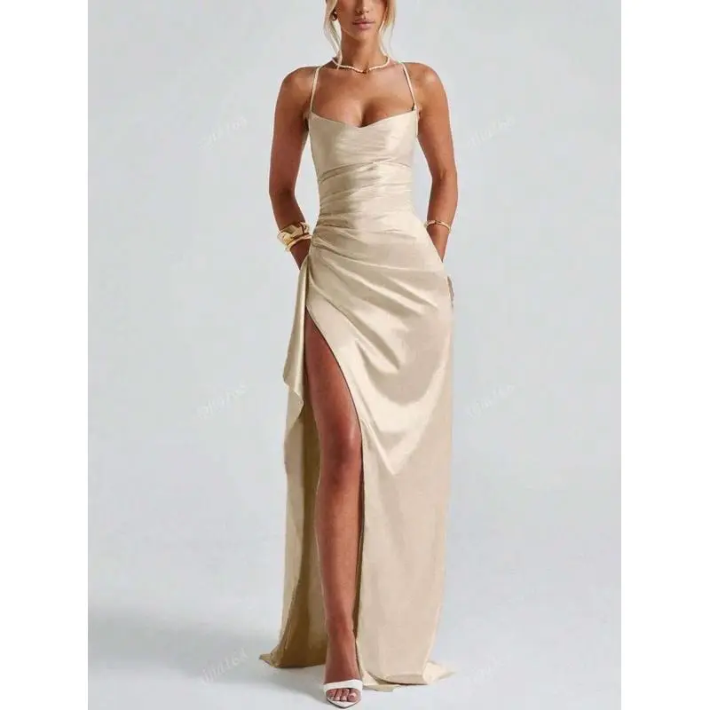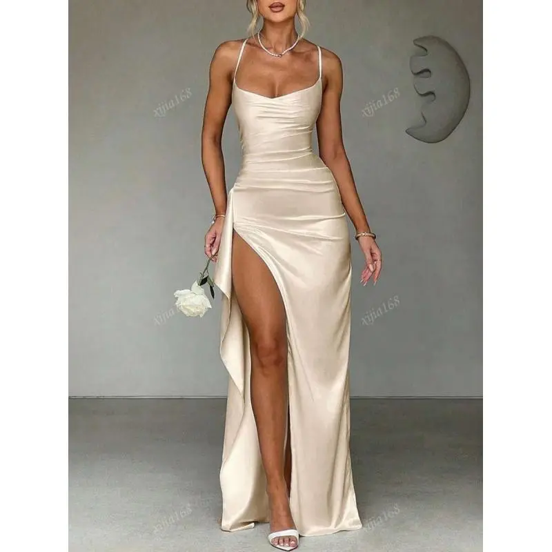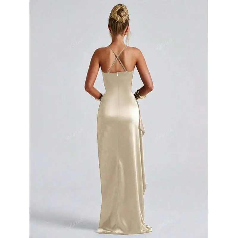 Neckline:Spaghetti Strap/Occasion:Night Out, Wedding, Party, Festival, Cocktail/Festivals:Christmas, Halloween, Carnivals, Oktoberfest in Munich, Spring Festival/Pattern Type:Plain/Style:Party, Sexy/Hem Shaped:Slit/Waist Line:Natural(Mid Waist)/Type:Cami/Details:Backless, Bow, Zipper/Lined For Added Warmth:No/Body:No/Color:Champagne/Sleeve length: sleepveless/Length:Long/Fit Type:Slim Fit/Fabric Elasticity:Slight Stretch/Material:Satin/Composition:95% Polyester, 5% Elastane/Care Instructions:Machine wash, do not dry clean/Sheer:No