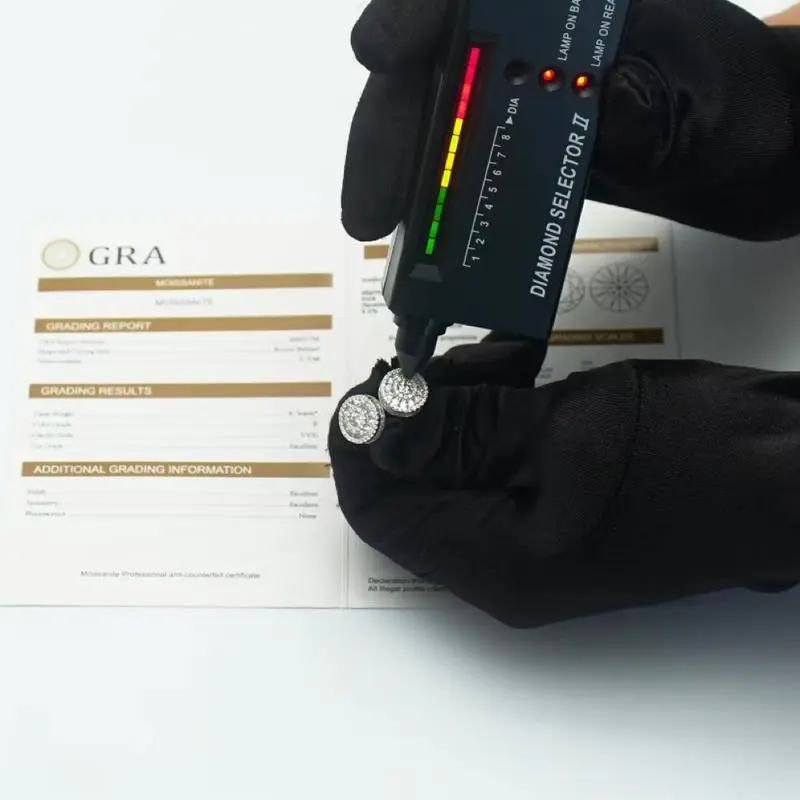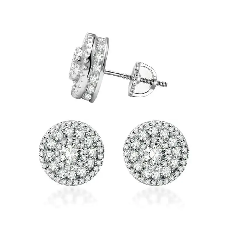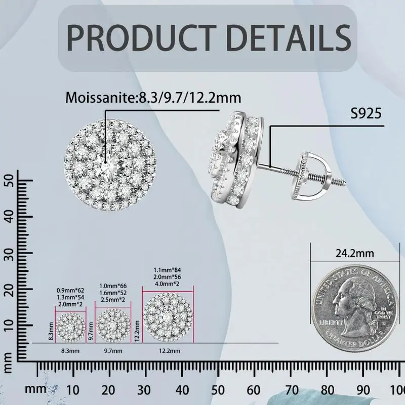 From Streets to Suites, Bling Out Your Beat! • Outside Diameter&Carat: 8.3MM: 0.9mm*62, 1.3mm*54, 2.0mm*2, Total: 0.8ct 9.7MM: 1.0mm*66, 1.6mm*52, 2.5mm*2, Total: 1.2ct 12.2MM: 1.1mm*84, 2.0mm*56, 4.0mm*2, Total: 3ct • Metal: D Color VVS Lab-Created Moissanite with S925 Sterling Silver • Color: White/Golden • Cutting: Round • Occasion: Wedding, Engagement, Anniversary, Party, Gift, Daily, Dating • Package includes: Jewelry box+Earrings+Certification • Excellent brilliance, hardness and clarity, the Lab-Created Moissanite stone sparkles and catches the light from every angle, offering exceptional value. • With a high-polish finish, they exude an extra touch of glamour, create a full "bling-out" effect. • Crafted from premium material, they resist tarnish and suit sensitive skin, durable for daily wear. • Unisex in design, perfect for elevating any outfit and stealing the spotlight at any event. • Whether marking a romance or friendship, these studs are a tangible reminder of special moments.