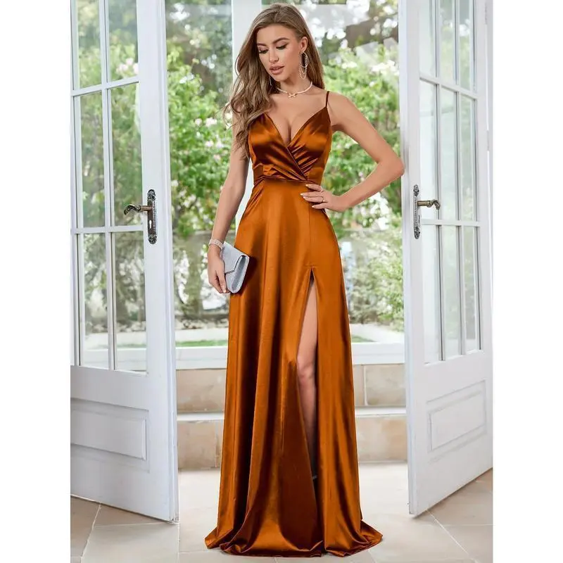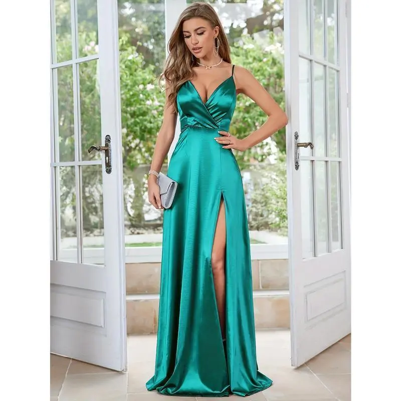 Composition: 95% Polyester,5% Elastane/Material: Satin/Length: Extra-long/Belt: No/Sleeve length: sleepveless/Chest Pad: No Padding/Hem Shaped: Ball Gown/Details: high slit/Pattern: Solid color/Applicable People: Adult/Sheer: No/Dresses Length: Floor-Length/Silhouette: Bodycon/Fabric Elasticity: Micro Elasticity/Type: A Pendulum/Contour: A/Season: All/Operation Instruction: Hand wash or professional dry clean/Style: Elegant/Printing Type: No Printing/Brand: MUXXN/Weaving Method: Knit Fabric/Collar Style: V-neck
