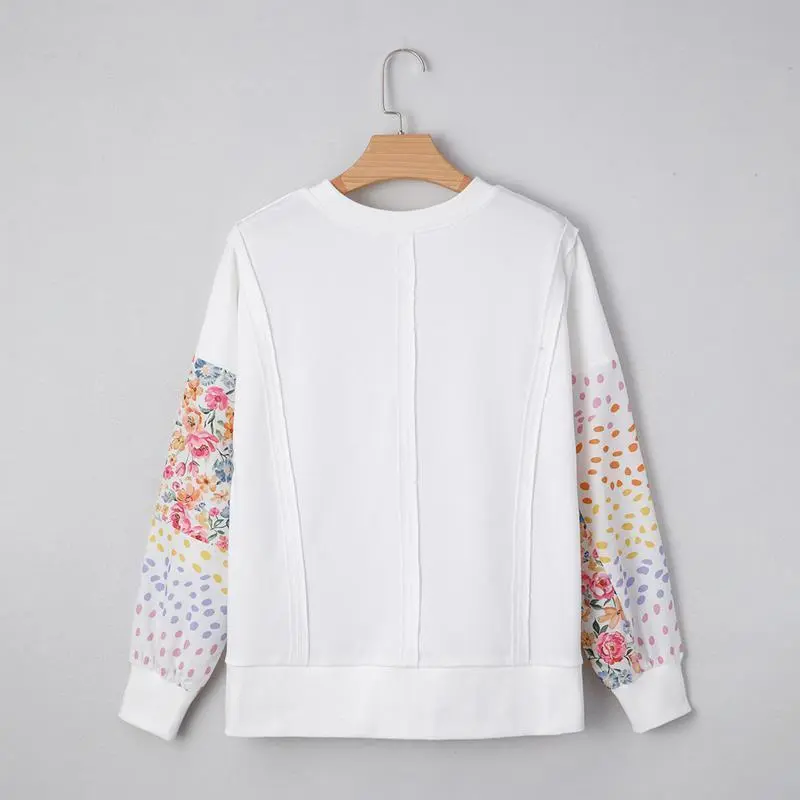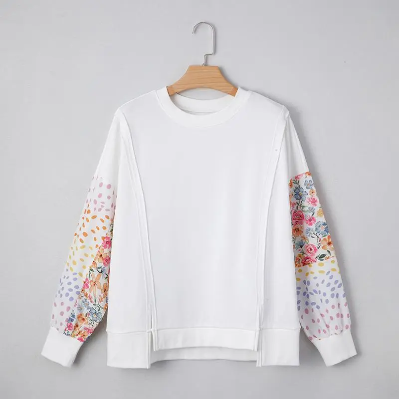 Women’sWhiteFloralDottedMixedPatchworkSleeveSeamedHighLowCasualSweatshirtPlusSizeSoftWomenswearFullSizeRangeS-4X(gift) Hoodie TopsGift
